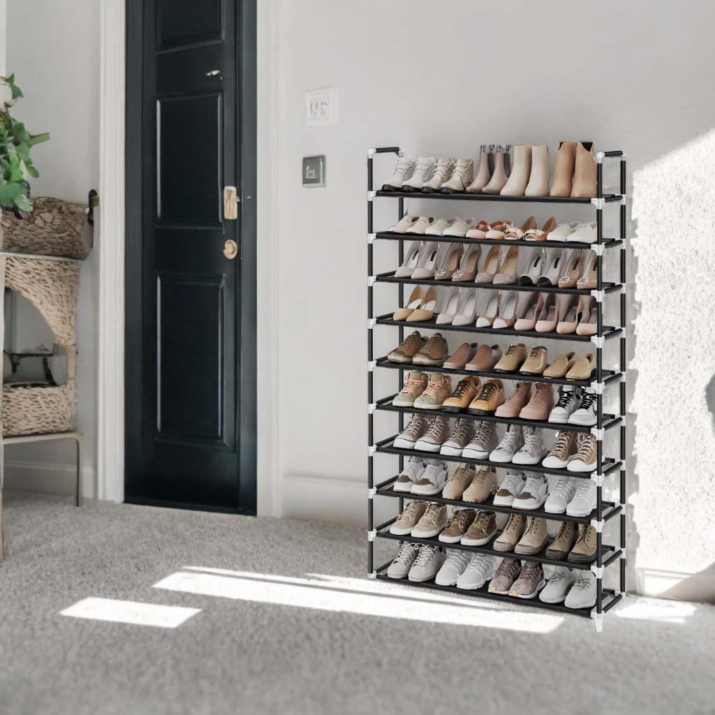 10-Tier Slim Shoe Rack for Entryway & Closet, Metal Frame with Non-Woven Shelves, Holds 40-50 Pairs, Space-Saving Design, Easy Assembly, Black
