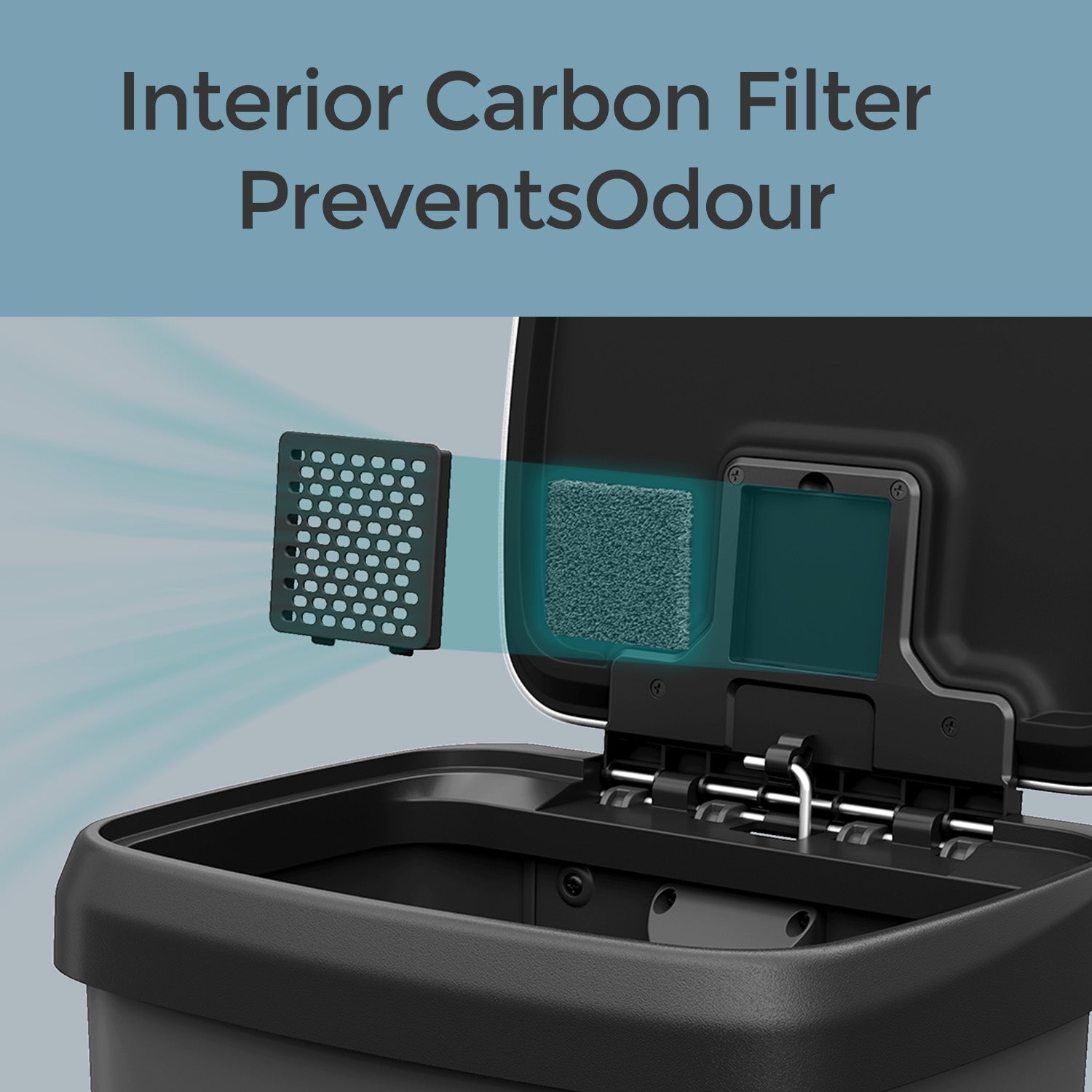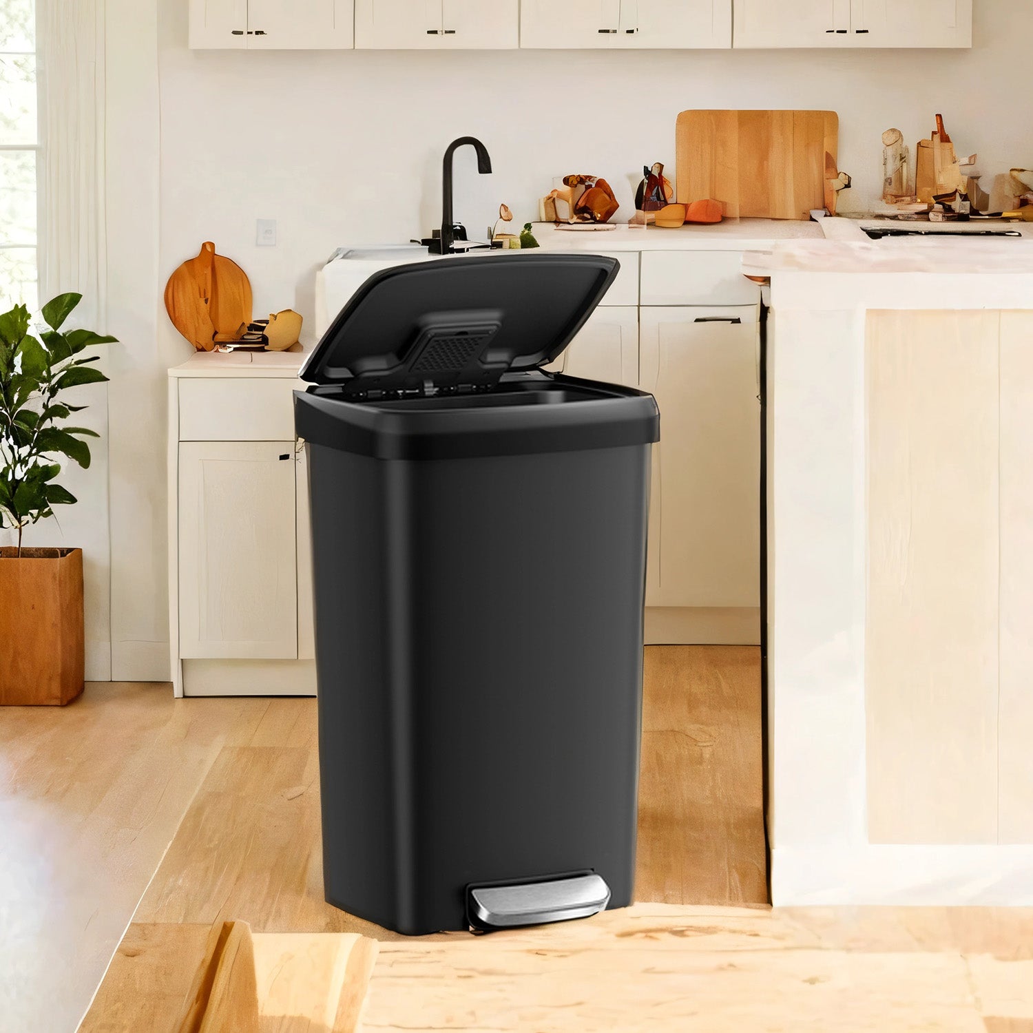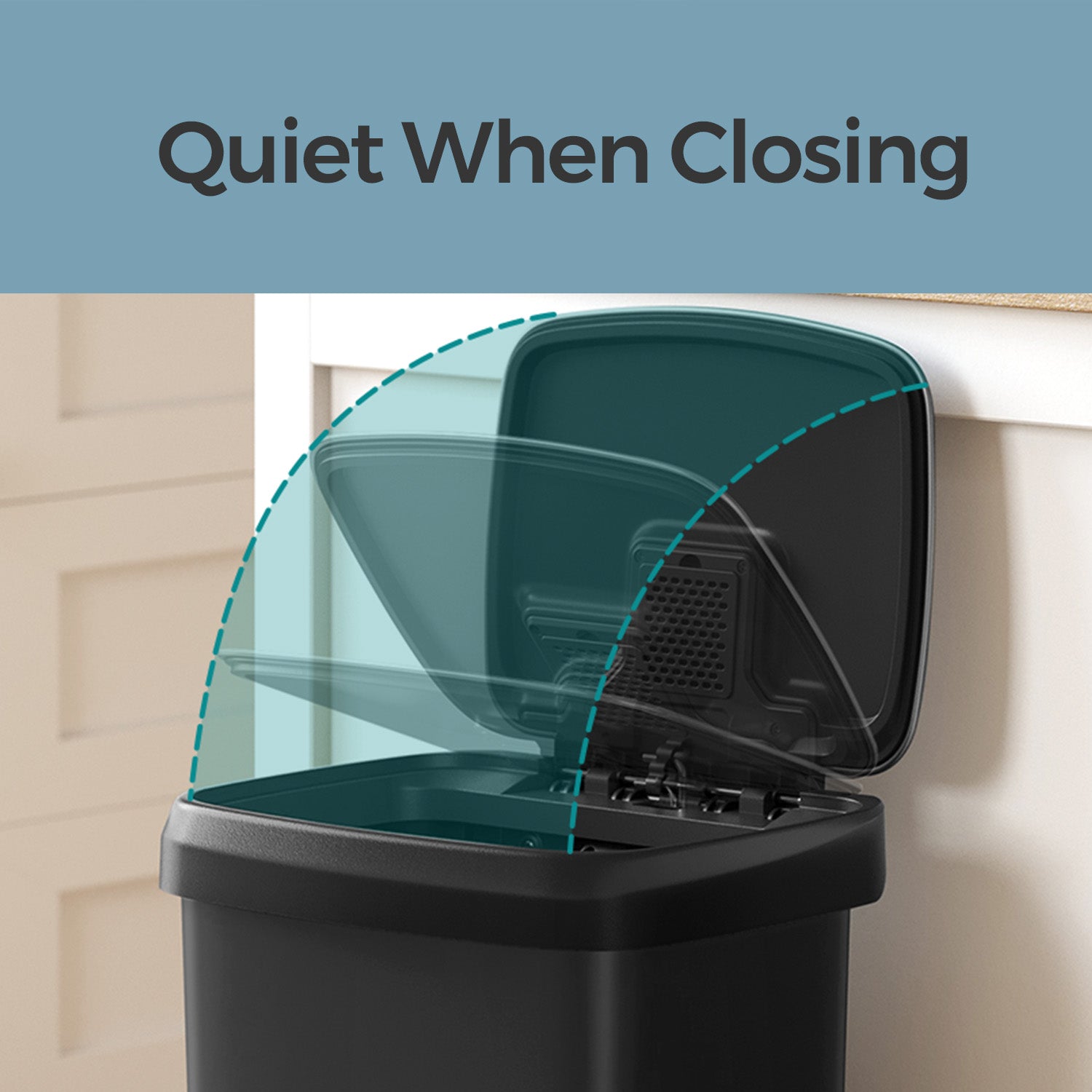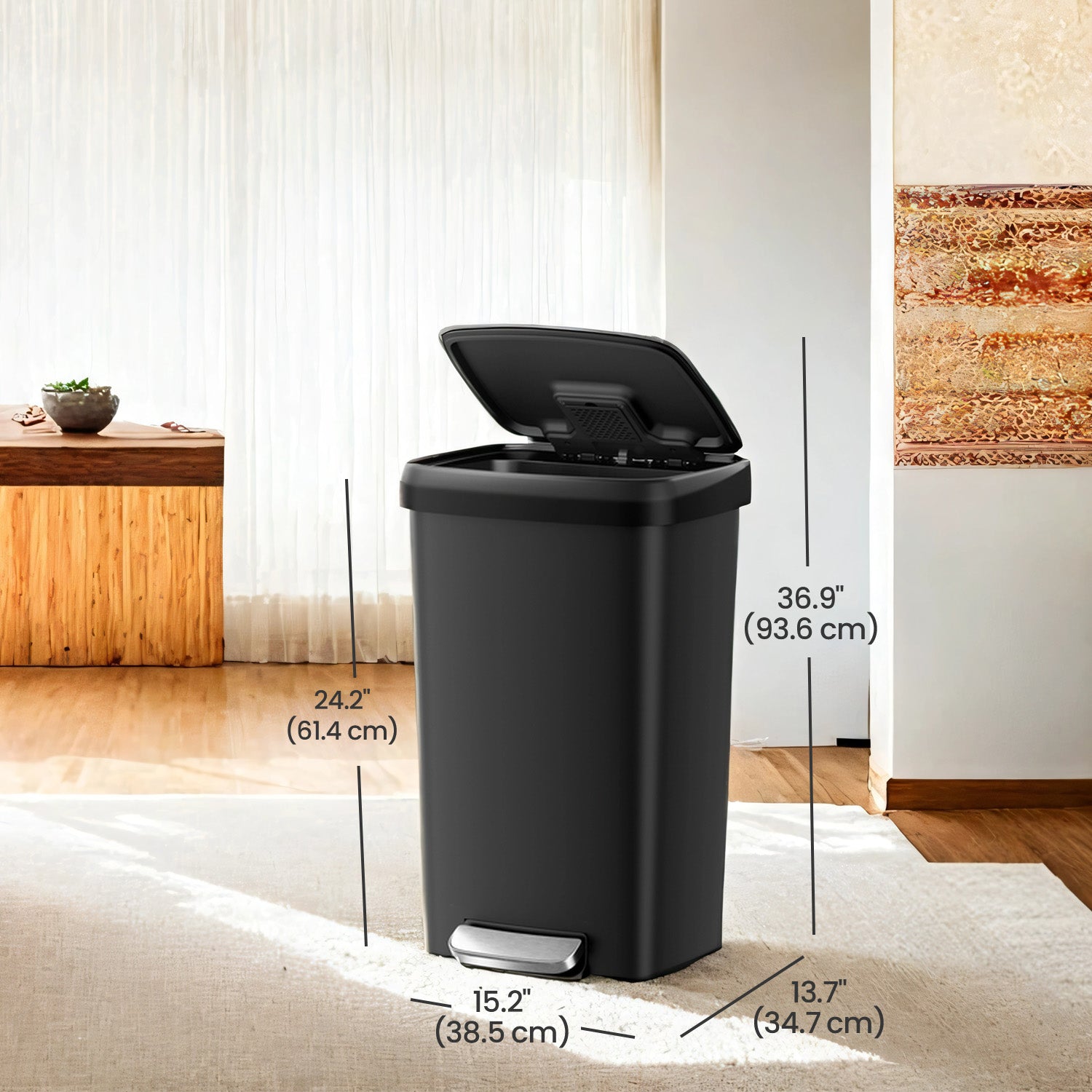 12-Gallon Plastic Trash Can with Stainless Steel Lid, Soft-Close Pedal Bin with Wheels & Carbon Filter,Ink Black