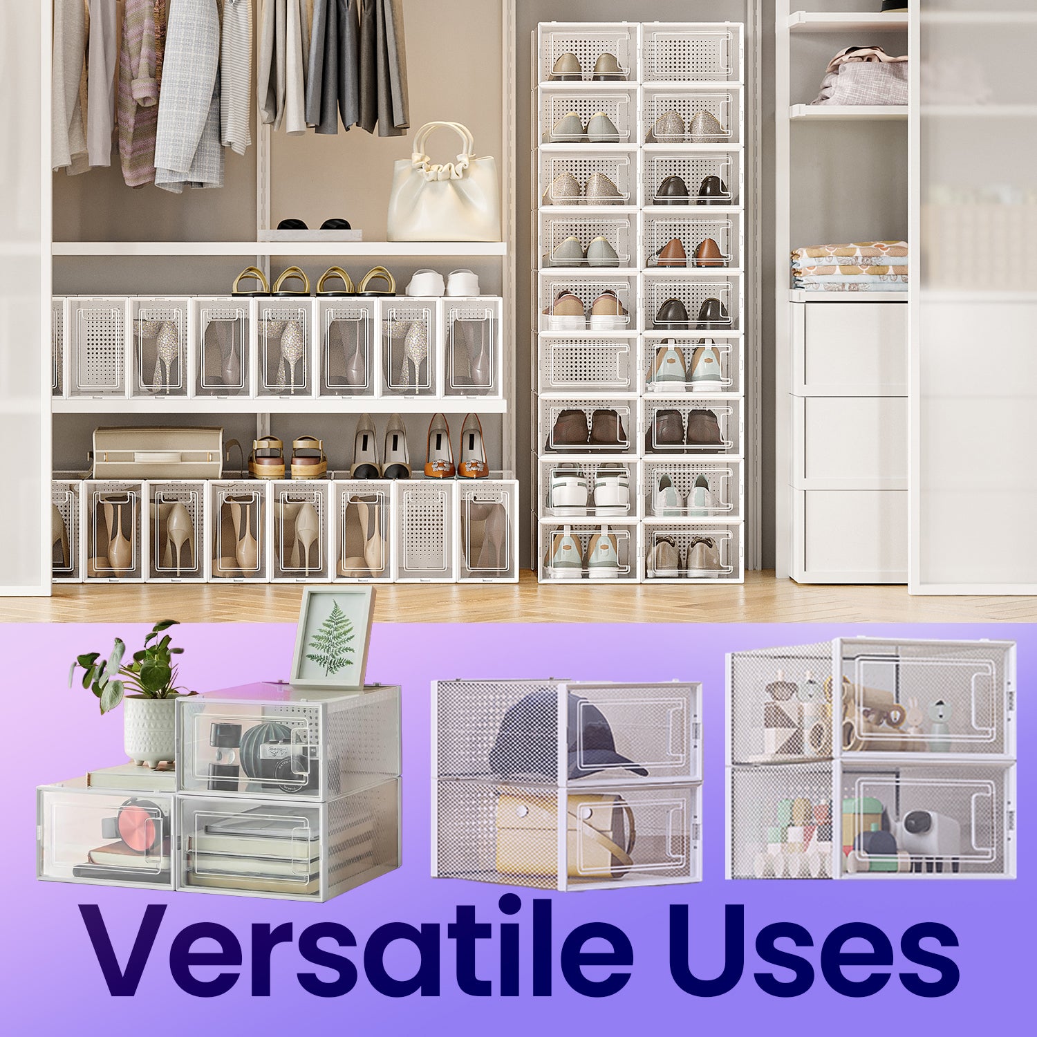 12-Pack Stackable Shoe Boxes with Clear Front Doors – Easy-Slide Organizers for Sneakers, Heels & Flats, Fits Up to Size 11, Transparent and White