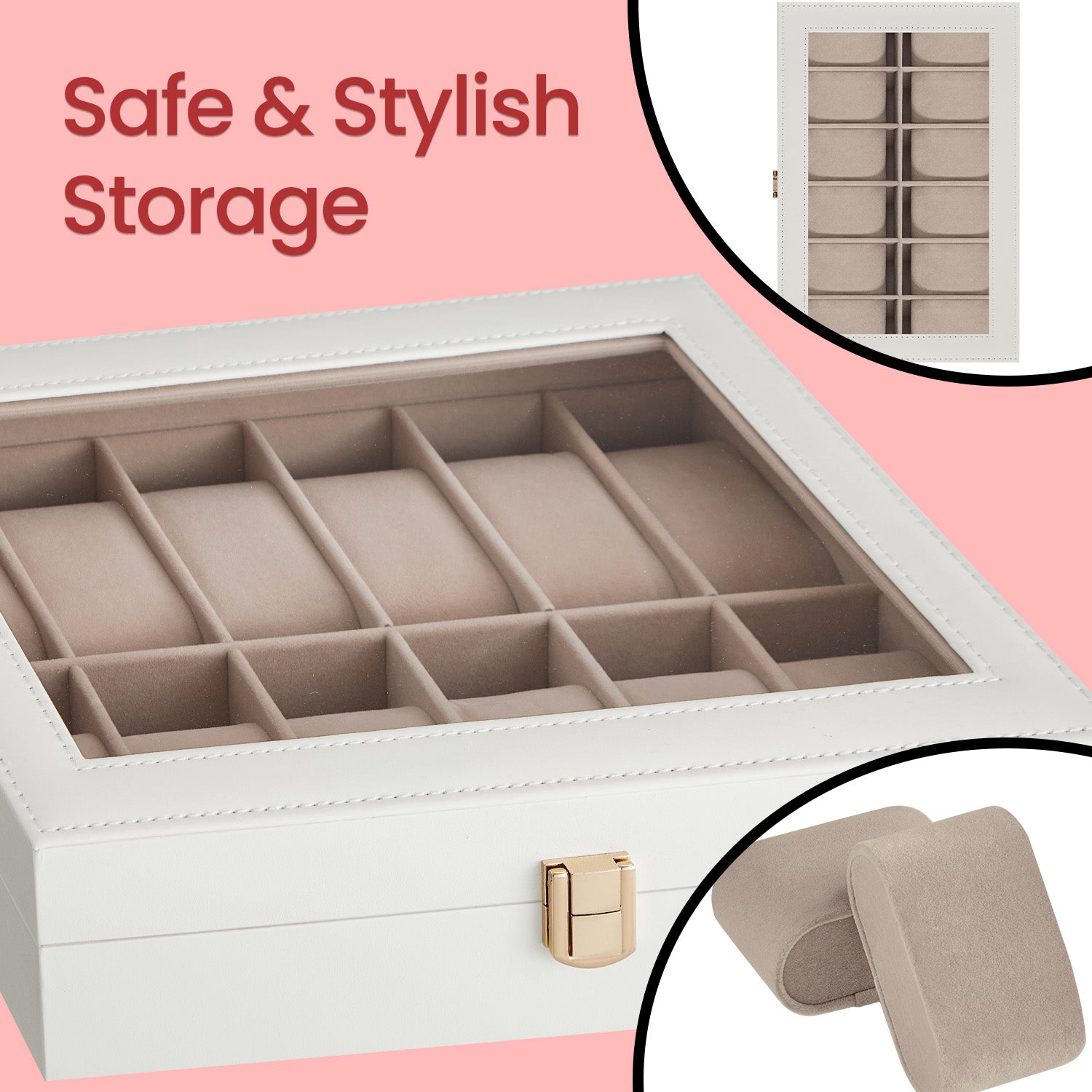 12-Slot Luxury Watch Display Case with Glass Top & Removable Pillows, PU Leather Watch Organizer, Gift Box, Cloud White and Cappuccino