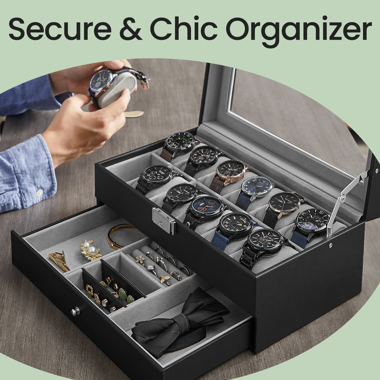 12-Slot Watch Box Organizer, 2-Layer Display Case with Glass Lid & Lock, Removable Pillows, for Watch Collection Storage, Gray