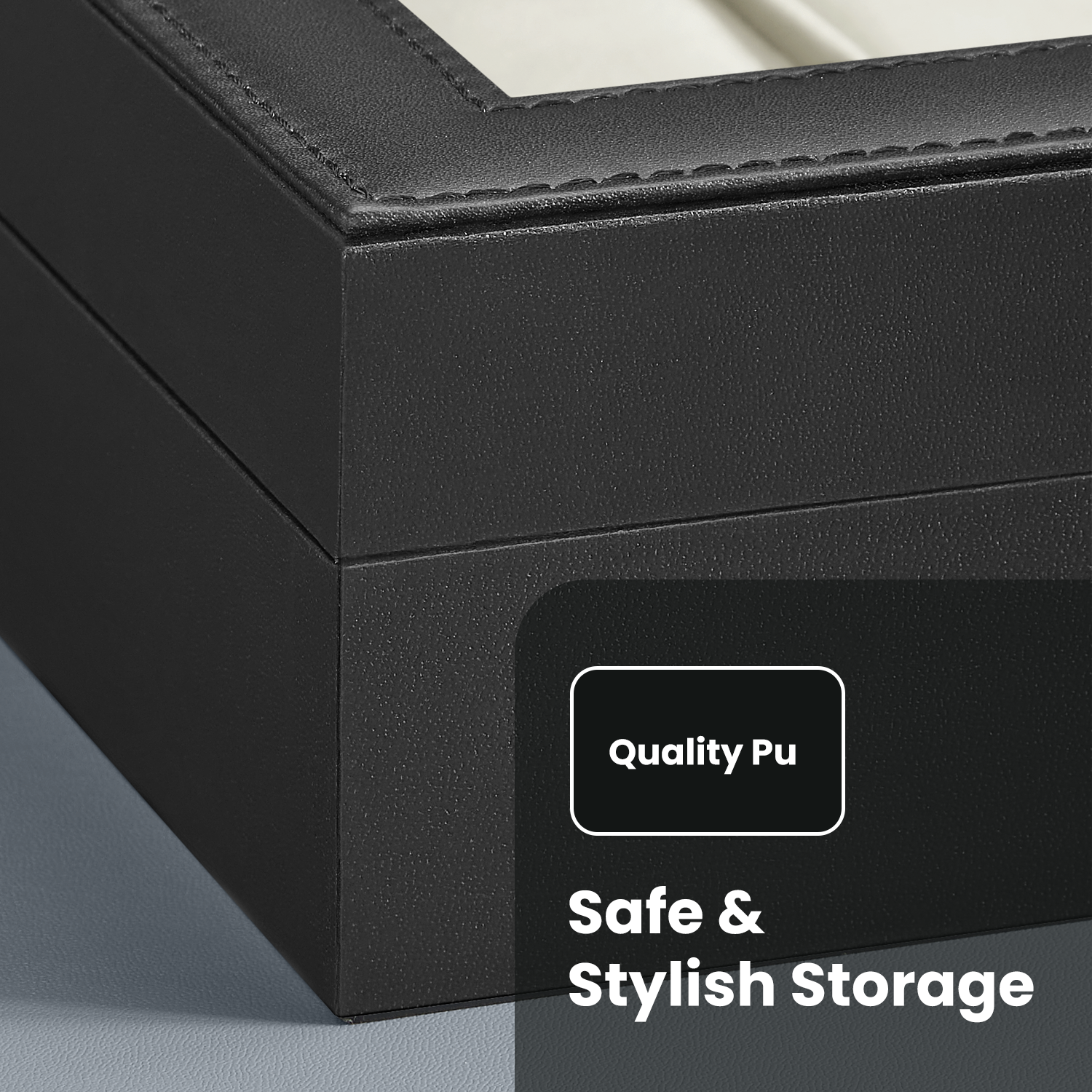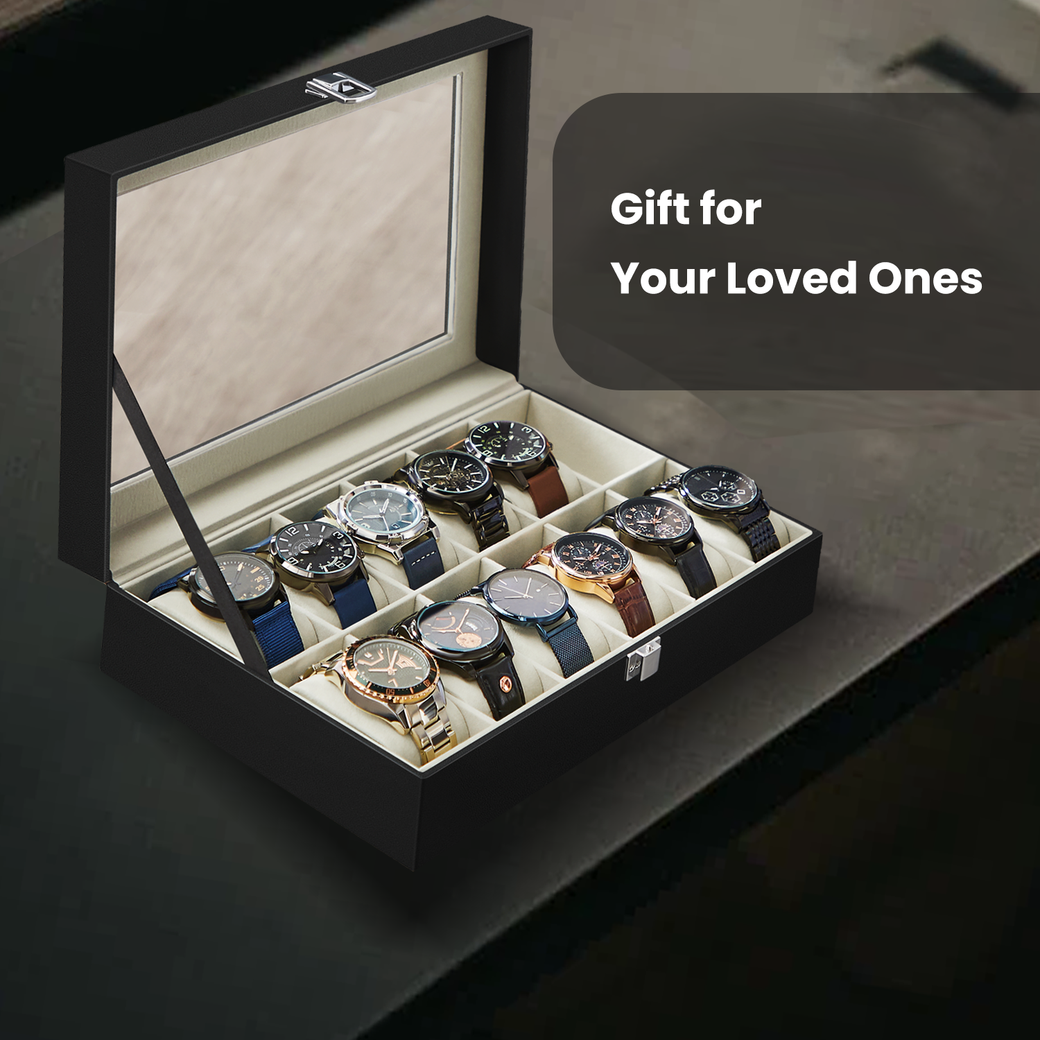 12-Slot Watch Display Case with Clear Glass Lid, Removable Pillows, PU Leather Exterior & Velvet Lining – Gift Box for Watch Enthusiasts, Black,Beige