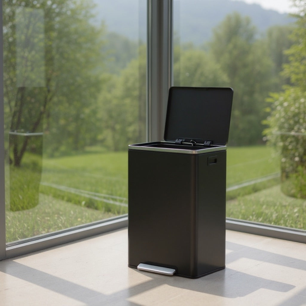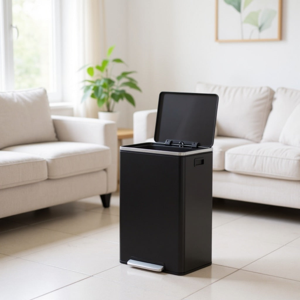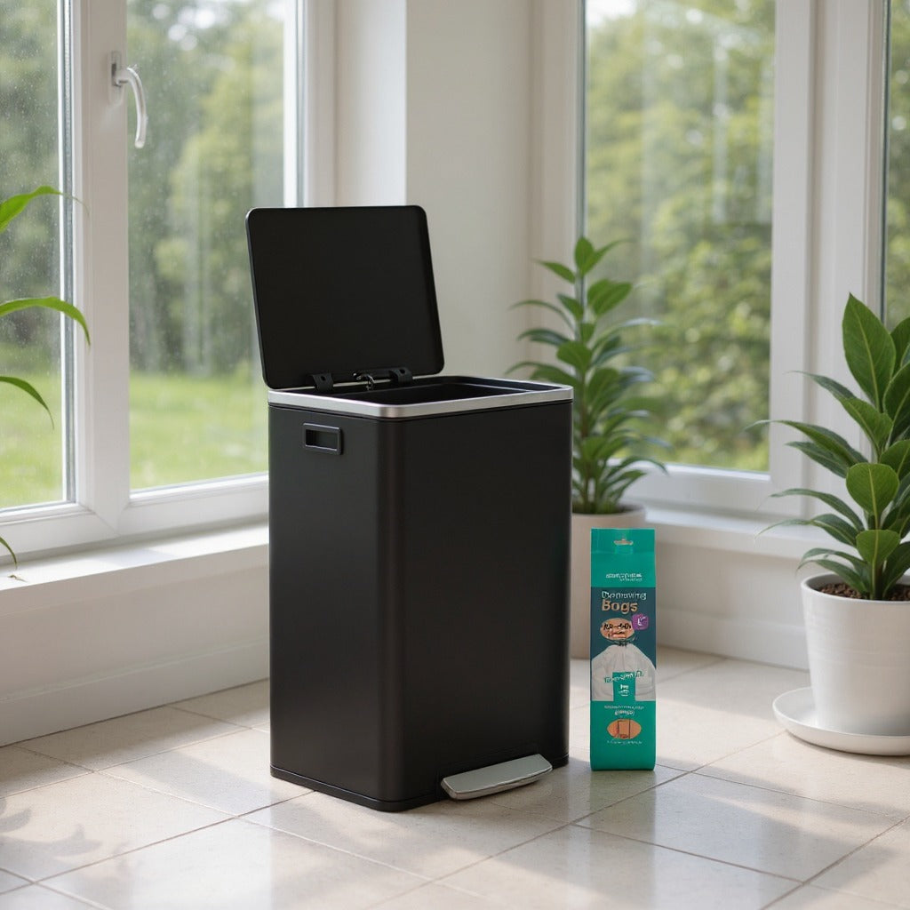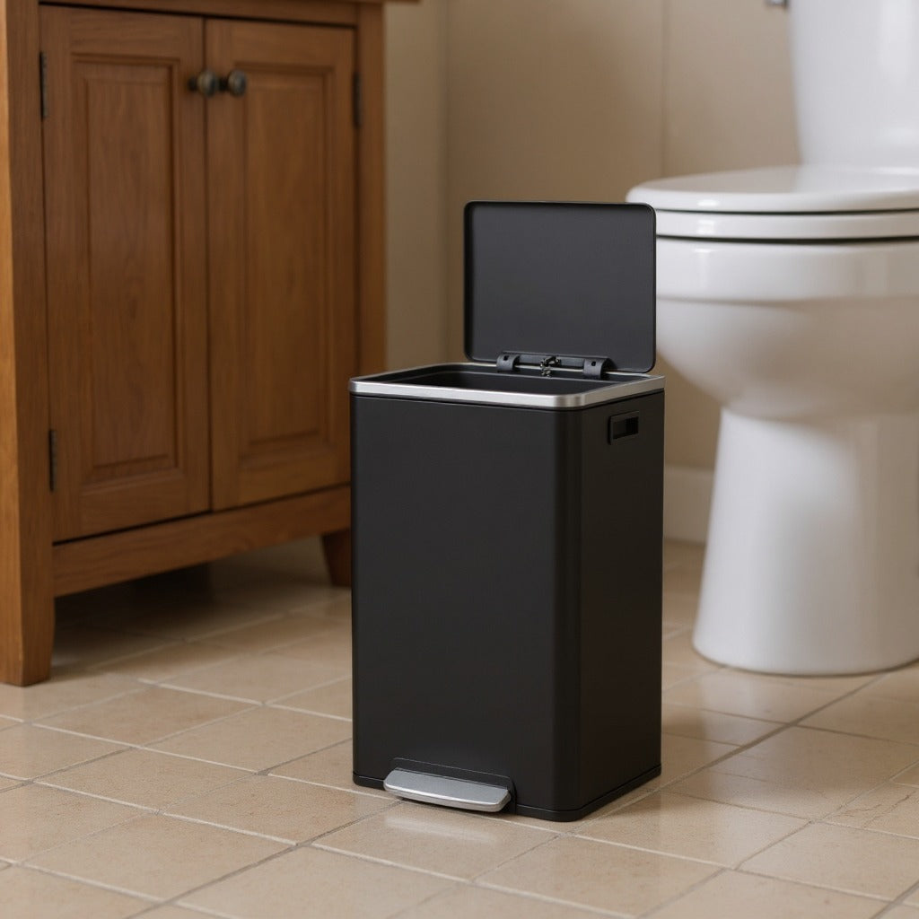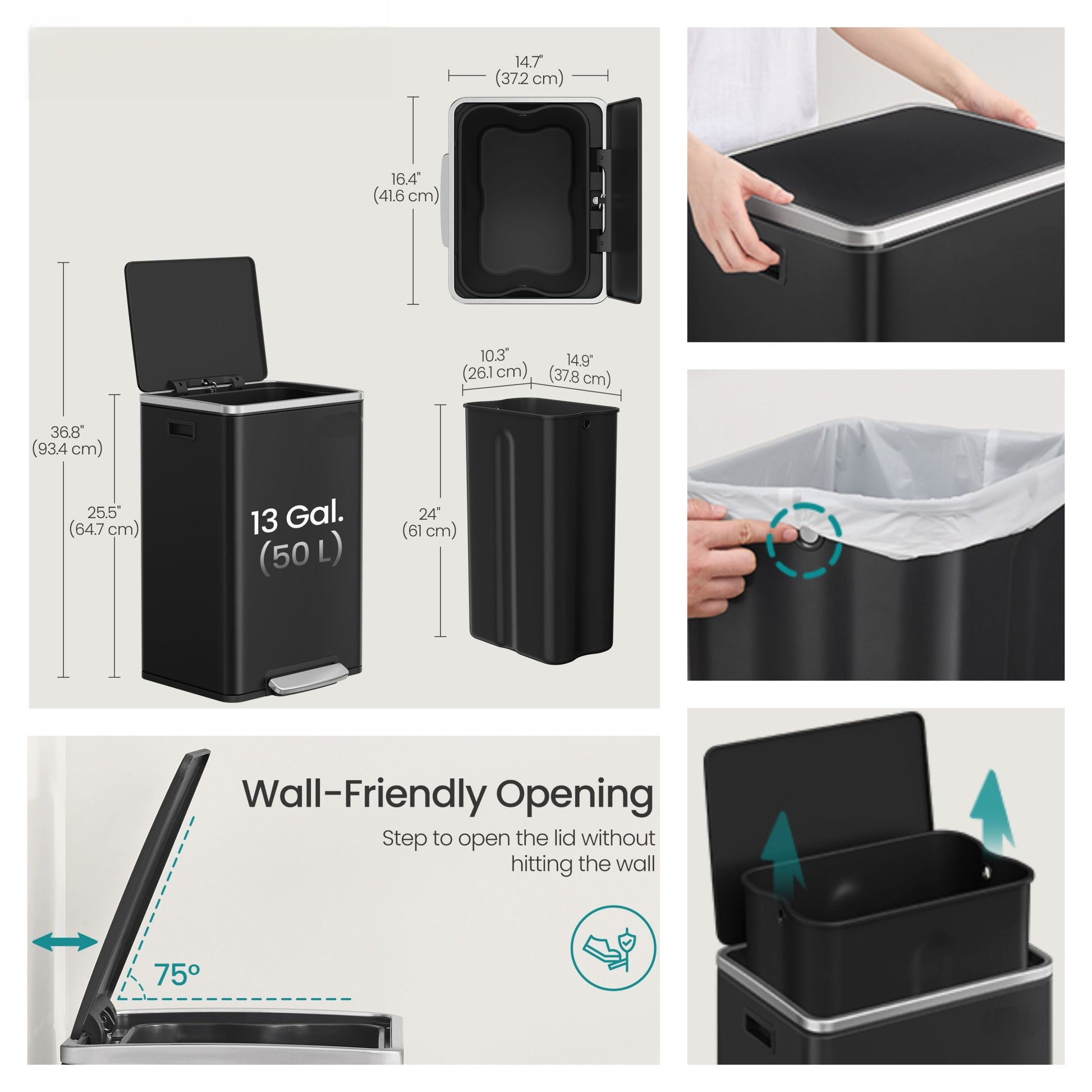 13-Gallon Trash Can with Soft-Close Lid, Removable Inner Bucket, Foot Pedal, Includes 15 Liners – Stainless Steel,Ink Black