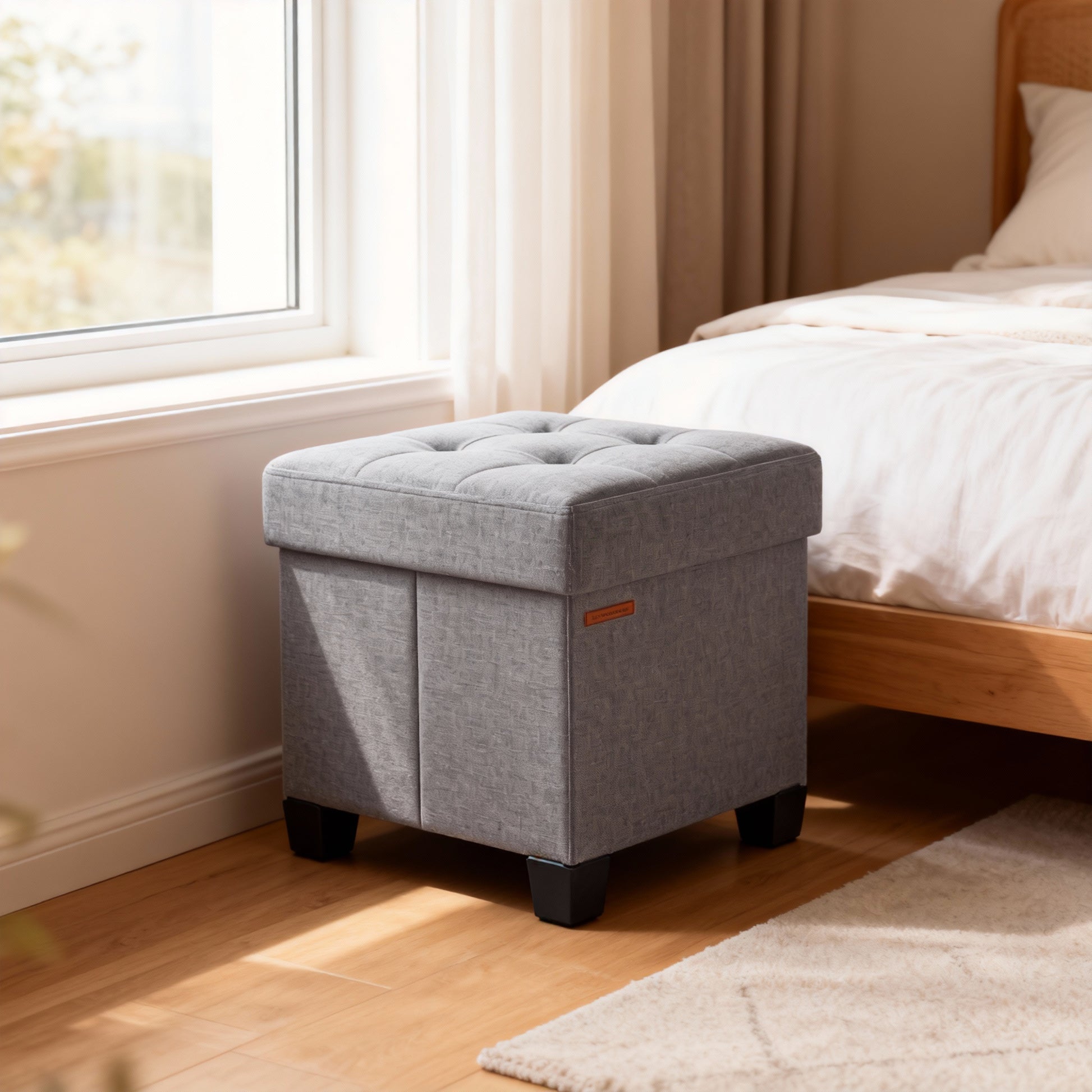 Upgrade your living space with this stylish 15-inch cube storage ottoman in dove gray. Featuring a chic linen-look fabric with elegant tufting and high-resilience foam, it provides lasting comfort for sitting or relaxing. Built with solid MDF panels, this ottoman supports up to 660 lb, ensuring durability for years of use. The 10-gallon hidden storage compartment offers ample space for books, blankets, or everyday items. Equipped with four plastic legs with non-slip pads, it protects your floors while maintaining stability. Perfect as a footrest, bench, coffee table, or extra storage solution, it fits seamlessly in bedrooms, living rooms, entryways, or dorms.