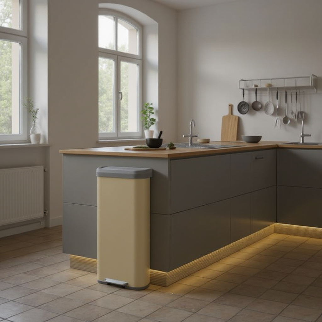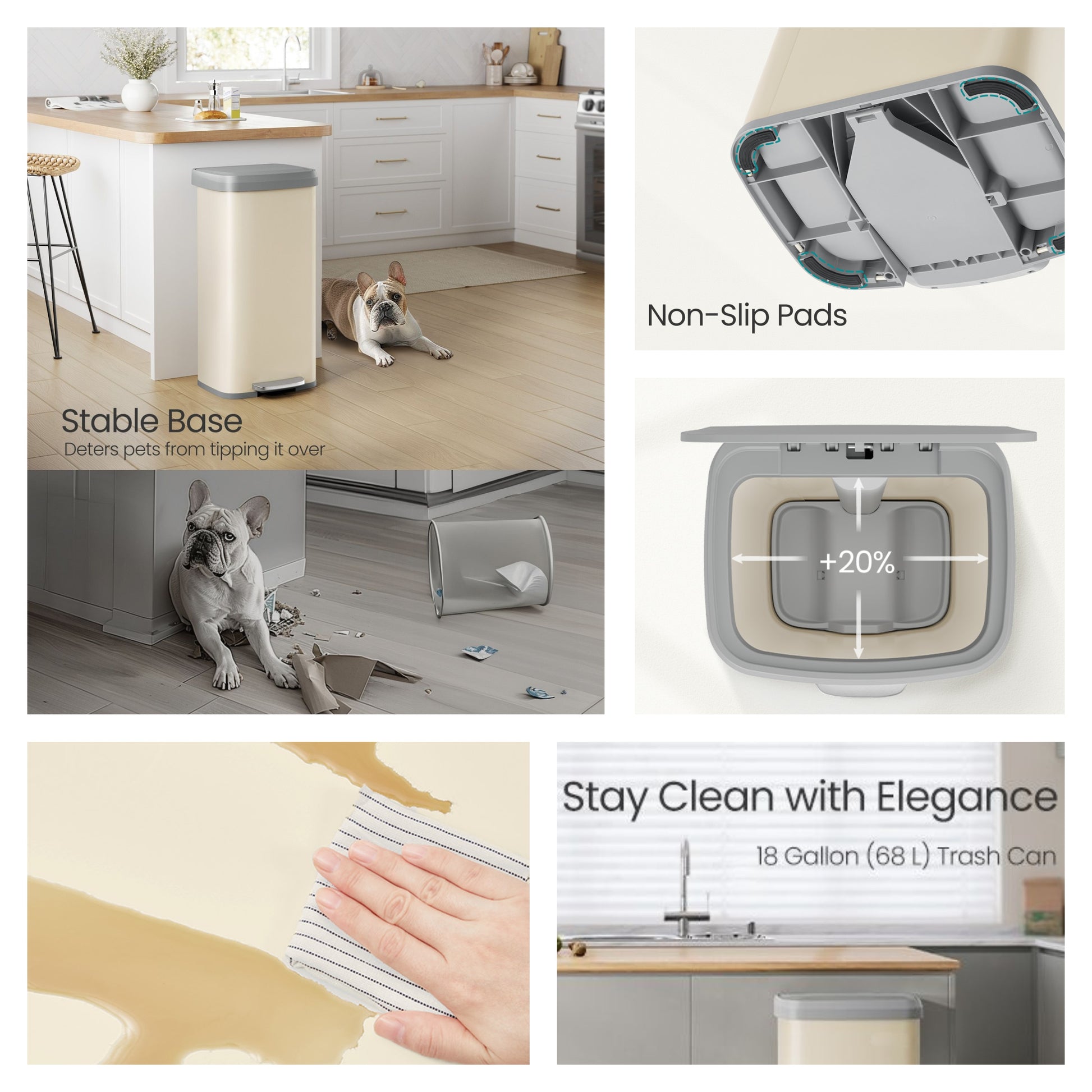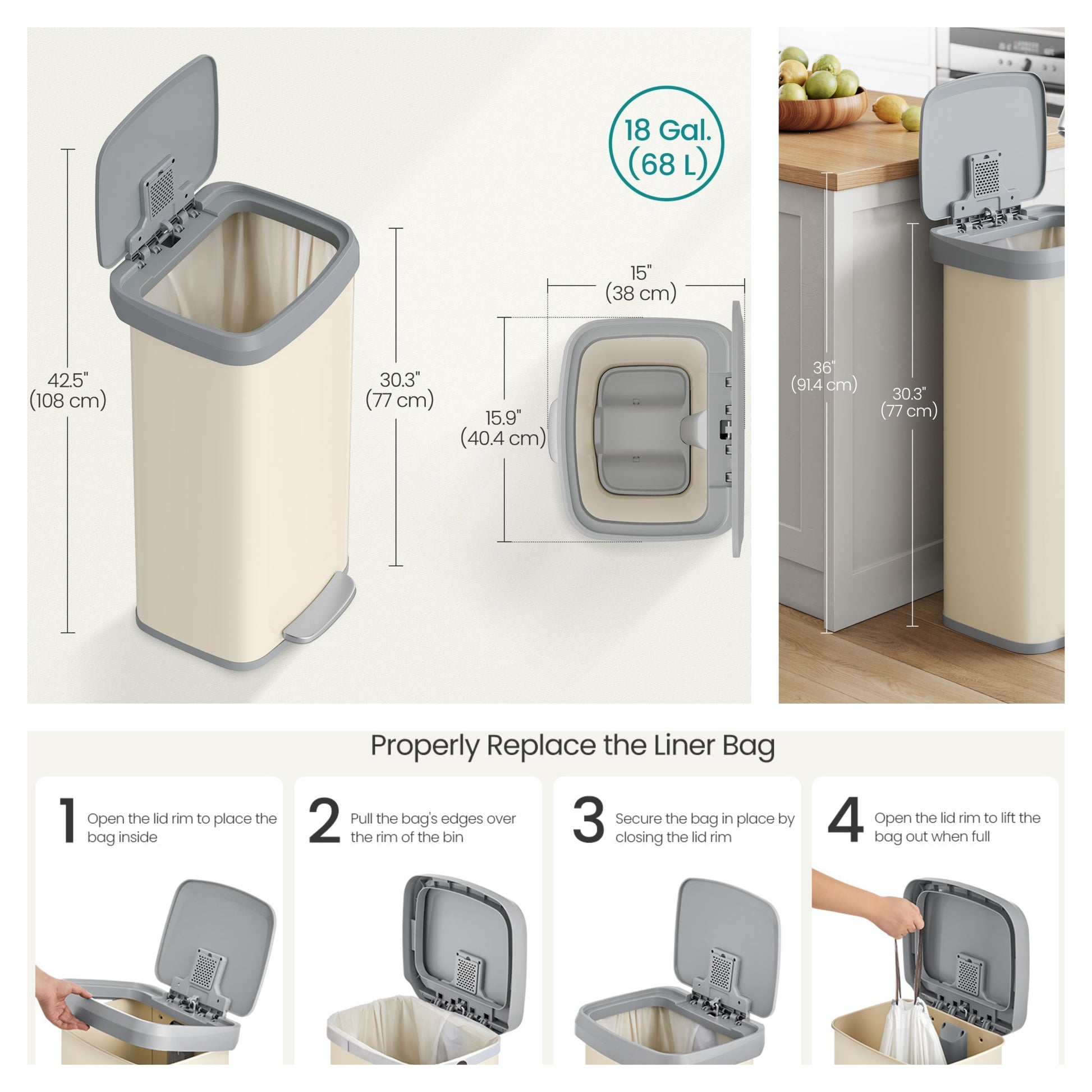 18 Gallon Stainless Steel Kitchen Trash Can, Stay-Open Lid with Step Pedal & Odor Filter, Large Capacity Bin, Sand Beige and Dove Gray