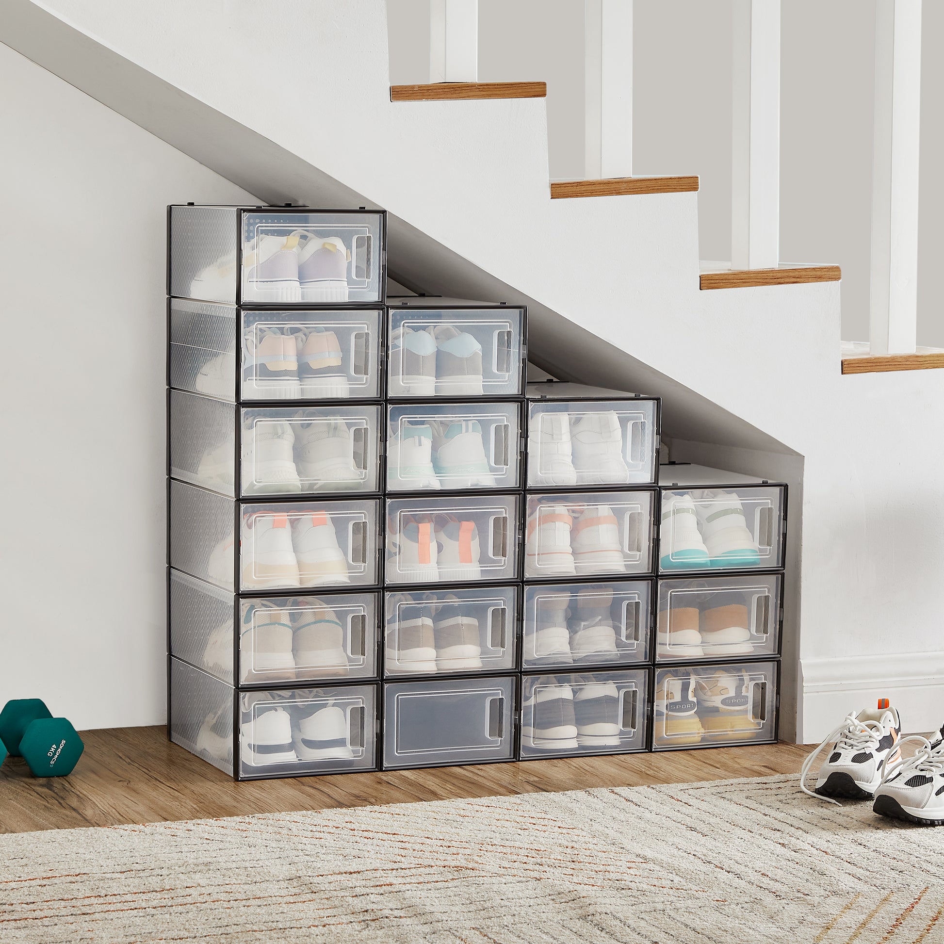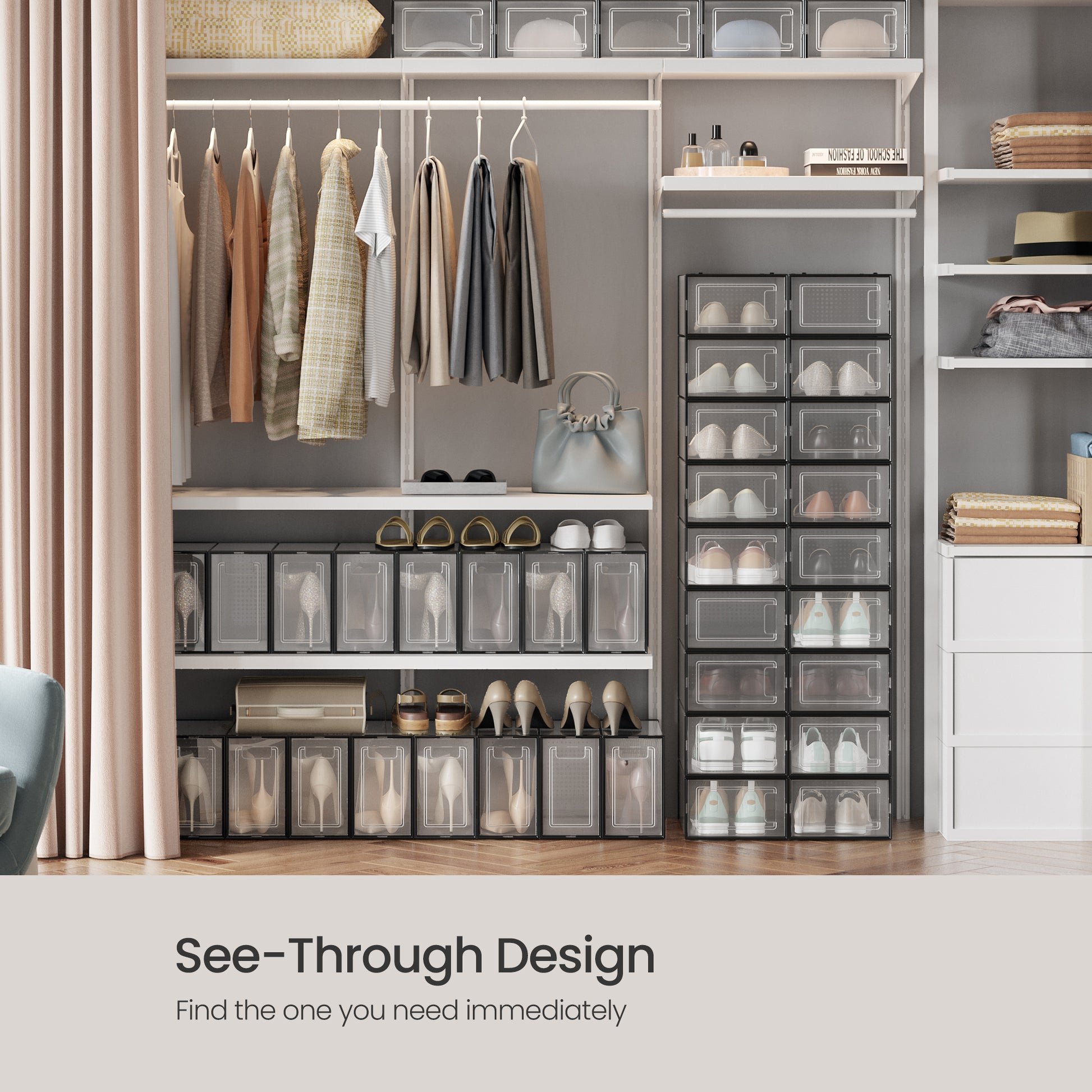 18-Pack Stackable Shoe Boxes - Clear Plastic Organizers with Ventilation, Fits Size 11 Sneakers, Foldable for Closet Storage, Transparent and Black
