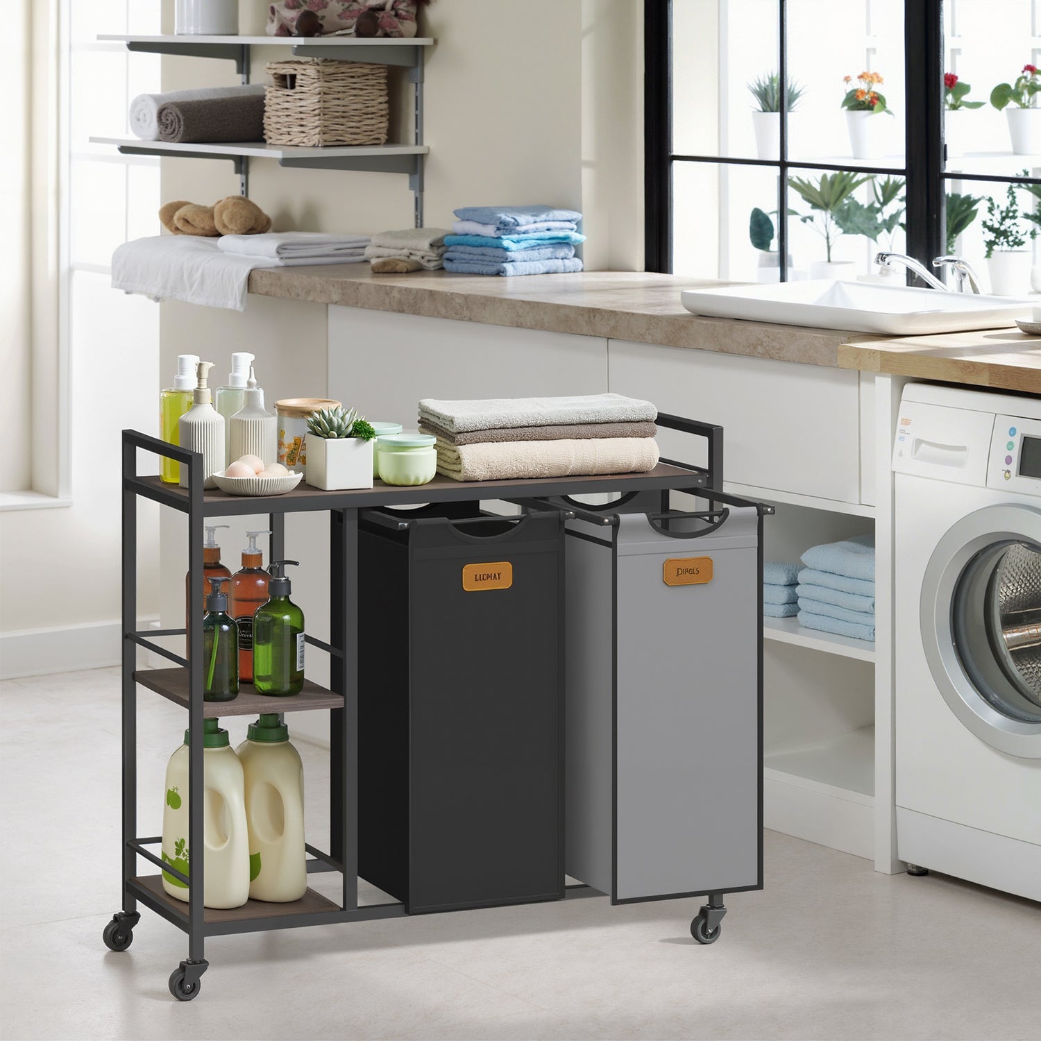 2-Compartment Rolling Laundry Sorter, 26.4 Gallon Capacity with Shelves & Labels, Mobile Storage Cart, Chestnut Brown, Ink Black and Dove Gray