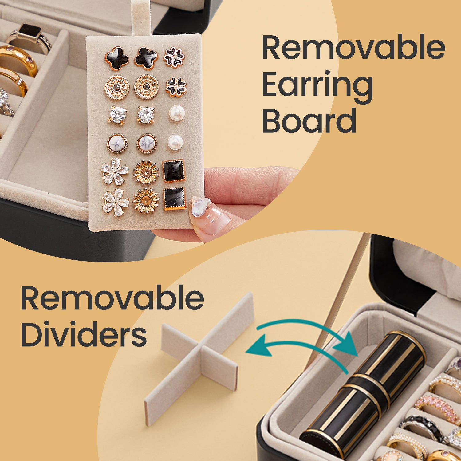 2-Layer Travel Jewelry Box Organizer with Removable Tray & Necklace Hooks, Compact Jewelry Storage Case for Earrings, Rings & Bracelets, Ink Black