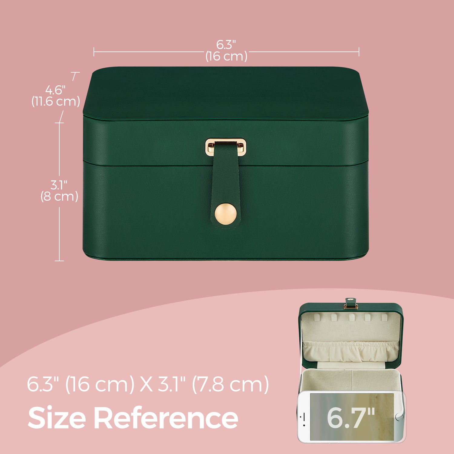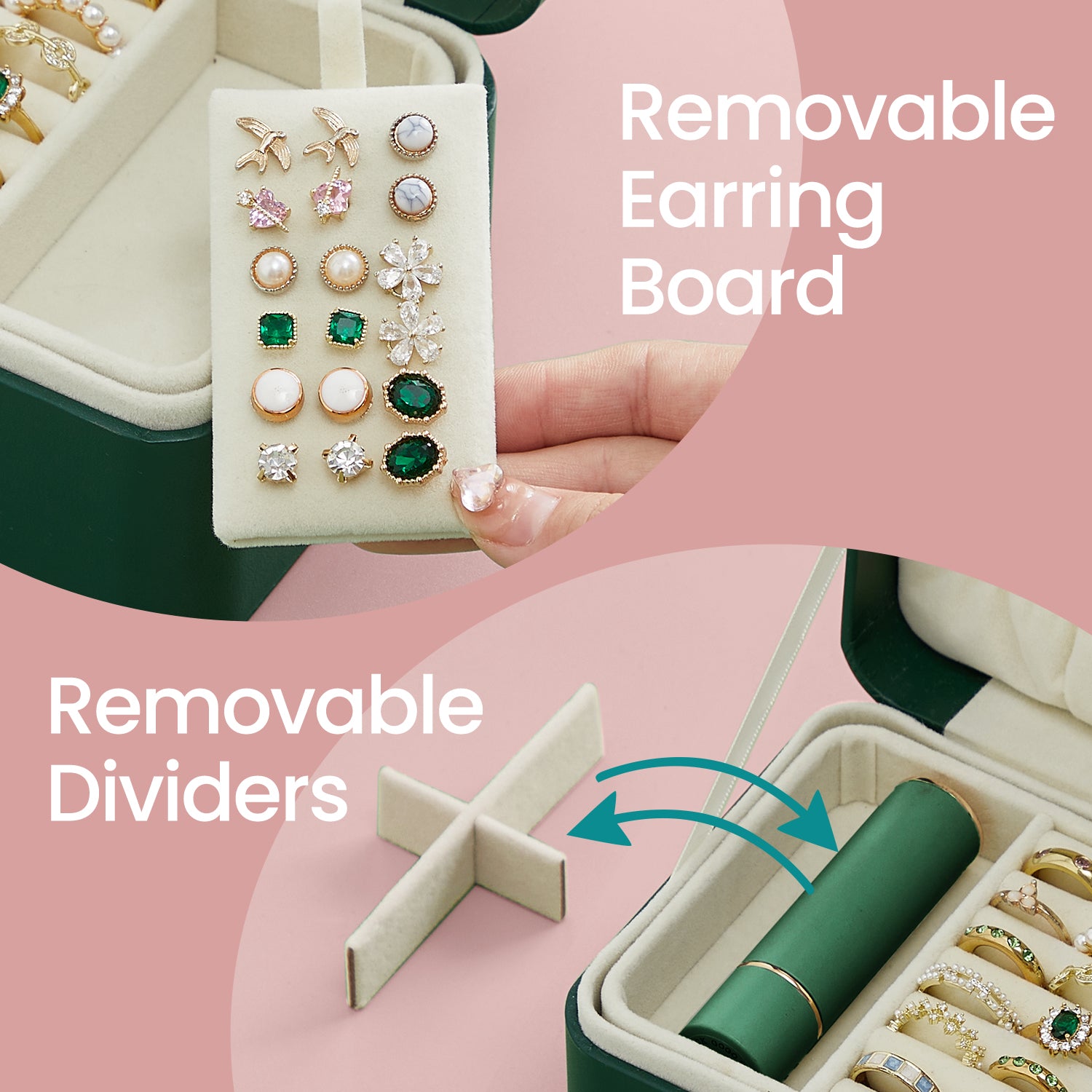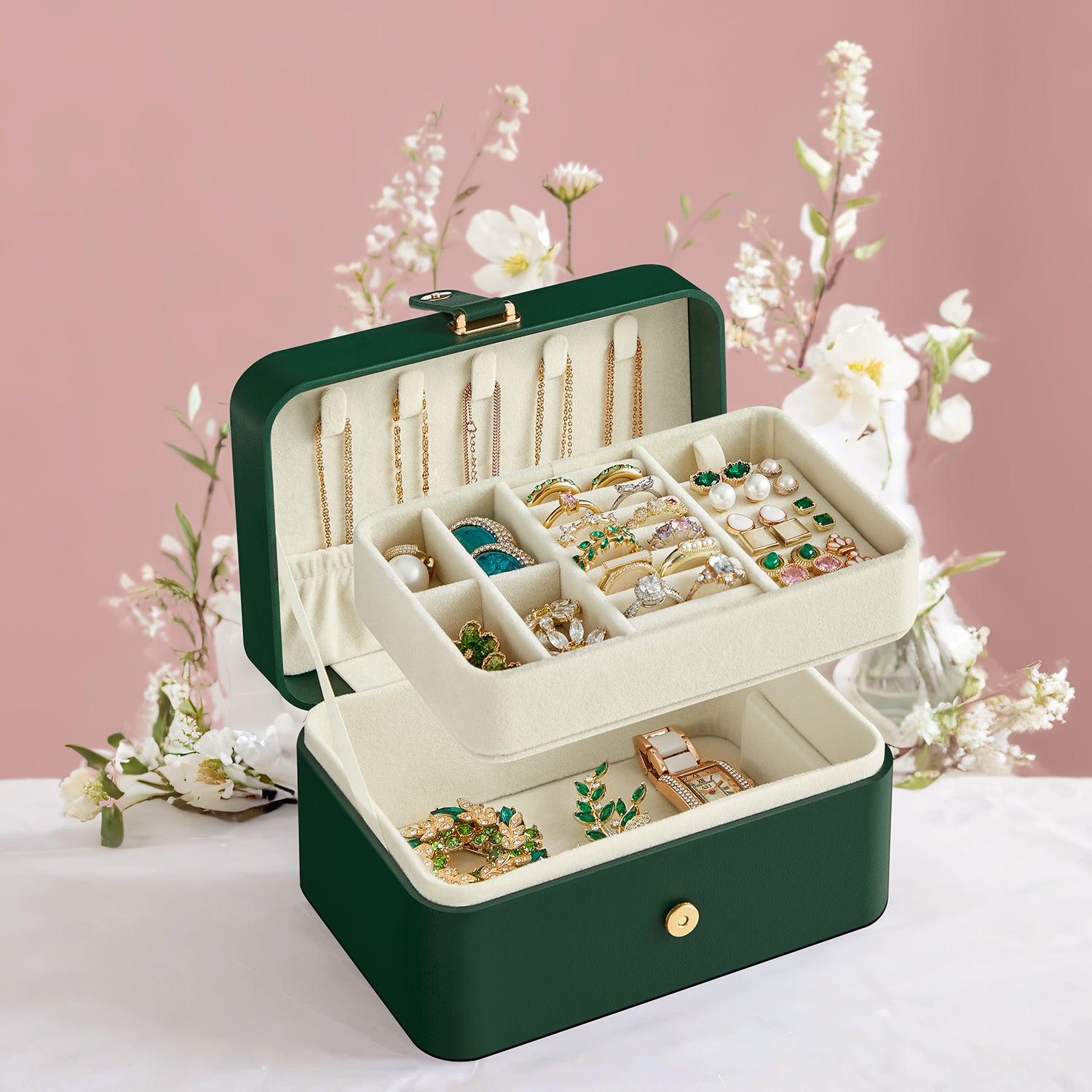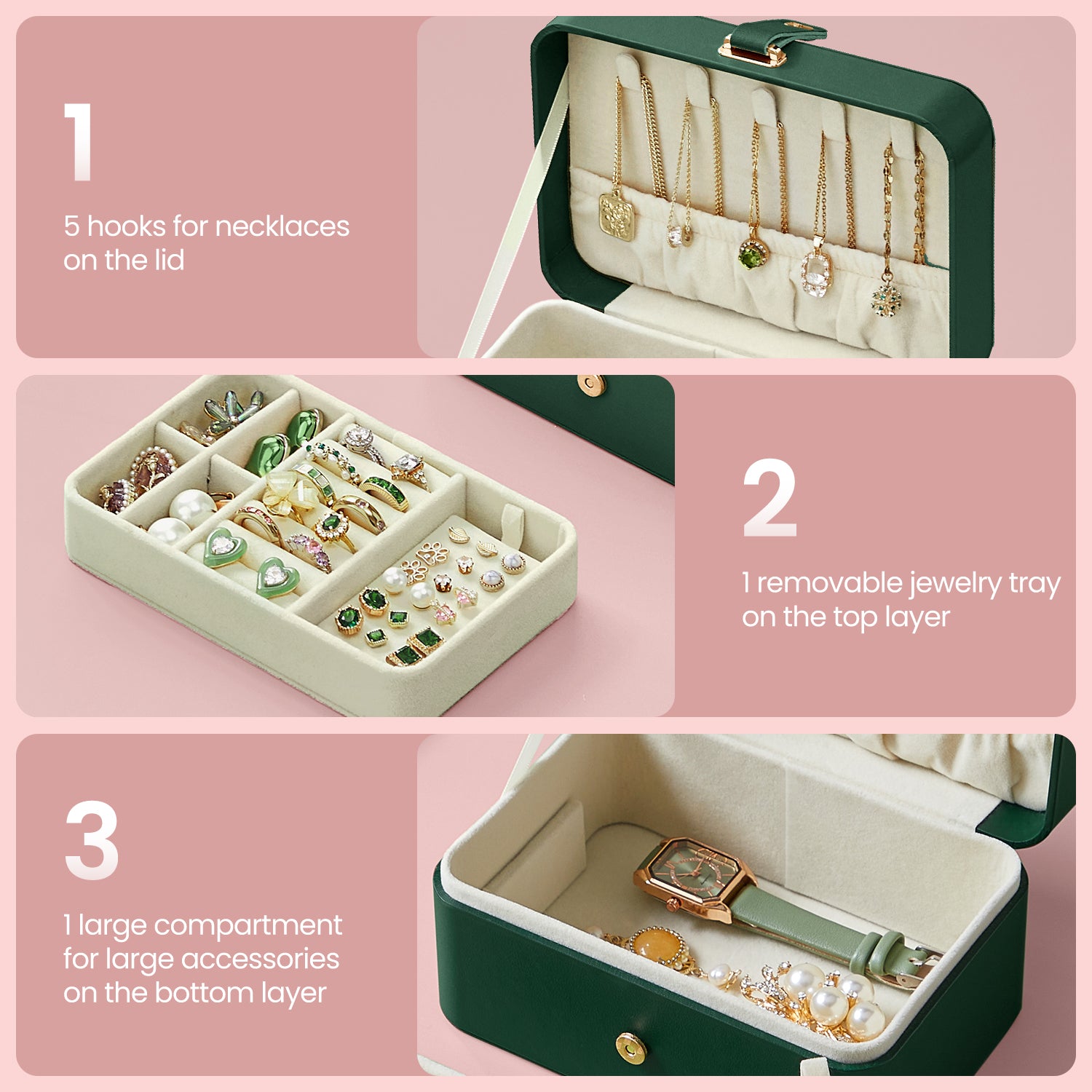 2-Layer Travel Jewelry Organizer Box, Portable Earring & Necklace Holder with Removable Tray, Magnetic Closure, Velvet Lining, Forest Green