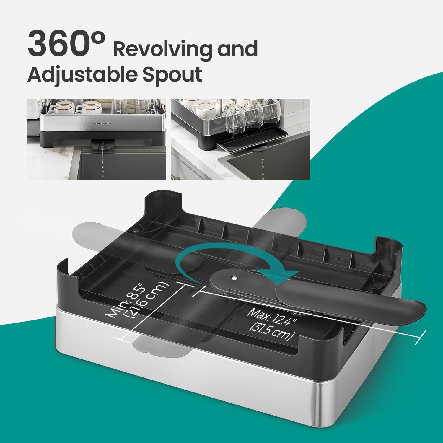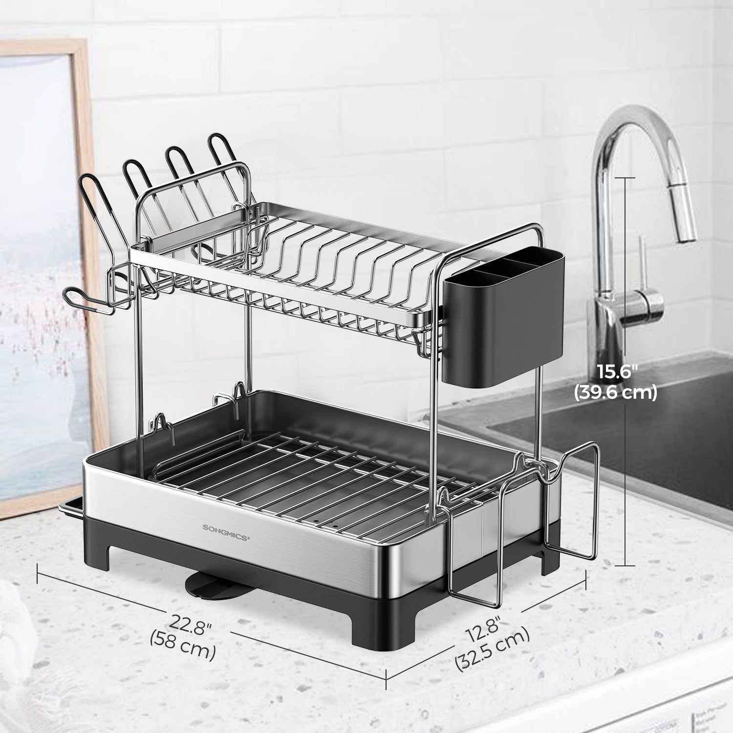 2-Tier Dish Drying Rack - Stainless Steel with Rotating Drain Spout, Holds Plates, Bowls, Cups, Utensil & Cutting Board Organizer, Silver and Black