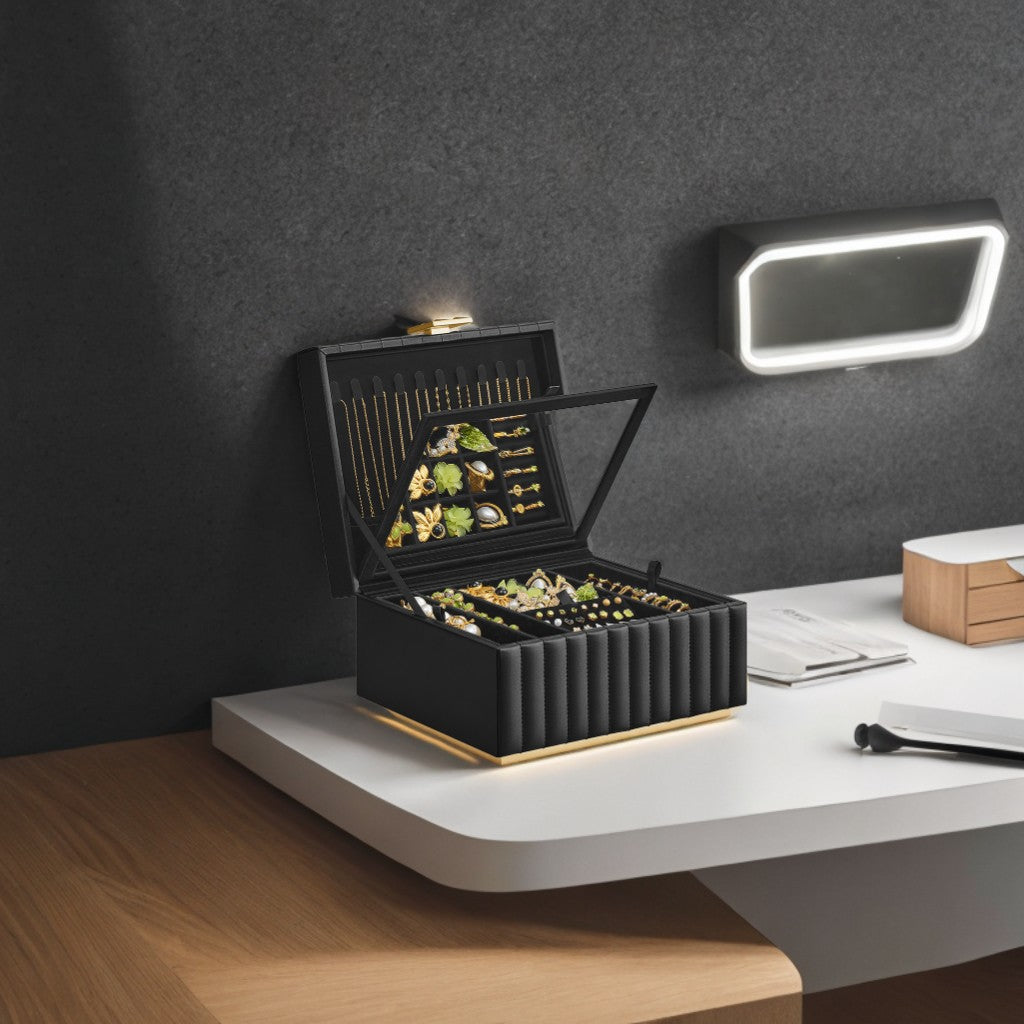 2-Tier Jewelry Box with Mirror & Removable Tray, PU Leather Organizer with Floating Base, Necklace, Earring Storage, Ink Black