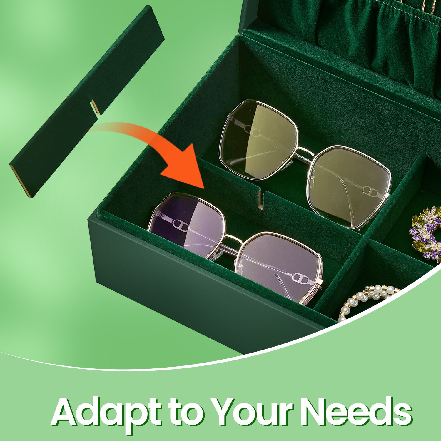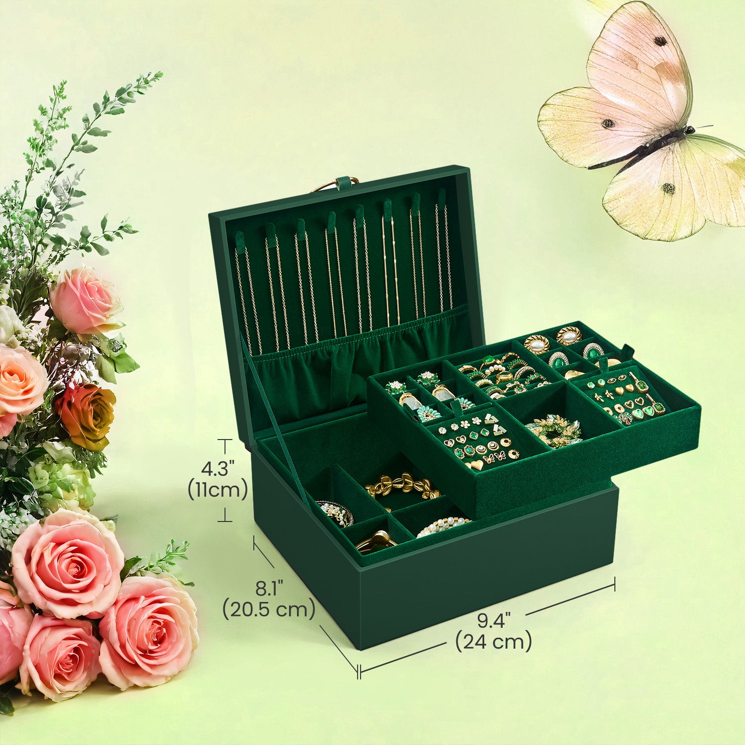2-Tier Jewelry Organizer Box with Removable Tray & Floating Base, Metal Handle, Dedicated Storage for Necklaces, Rings, Watches, Sunglasses, Forest Green