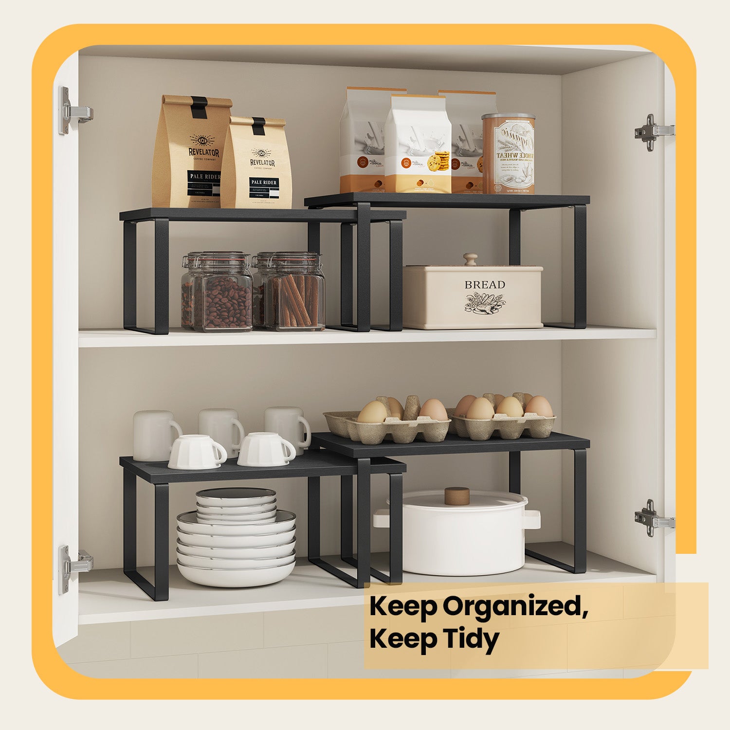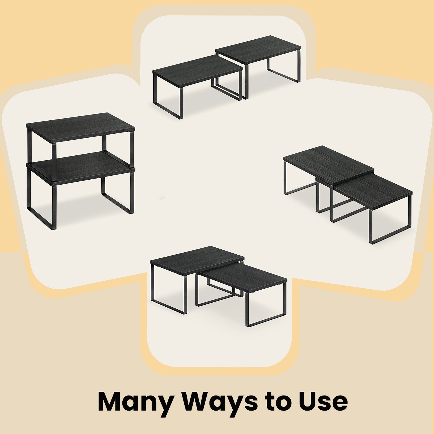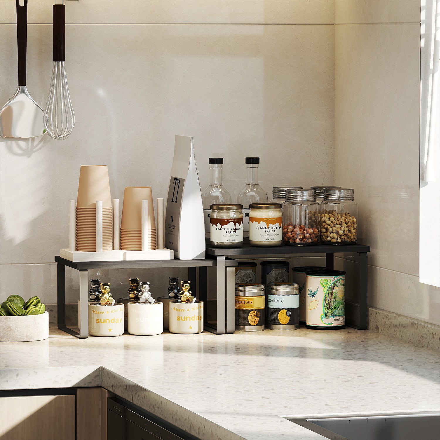 2-Tier Stackable Kitchen Shelf Organizer – Adjustable Countertop Storage for Spices, Utensils & Cookbooks,Expandable Metal,Wood Design, Black