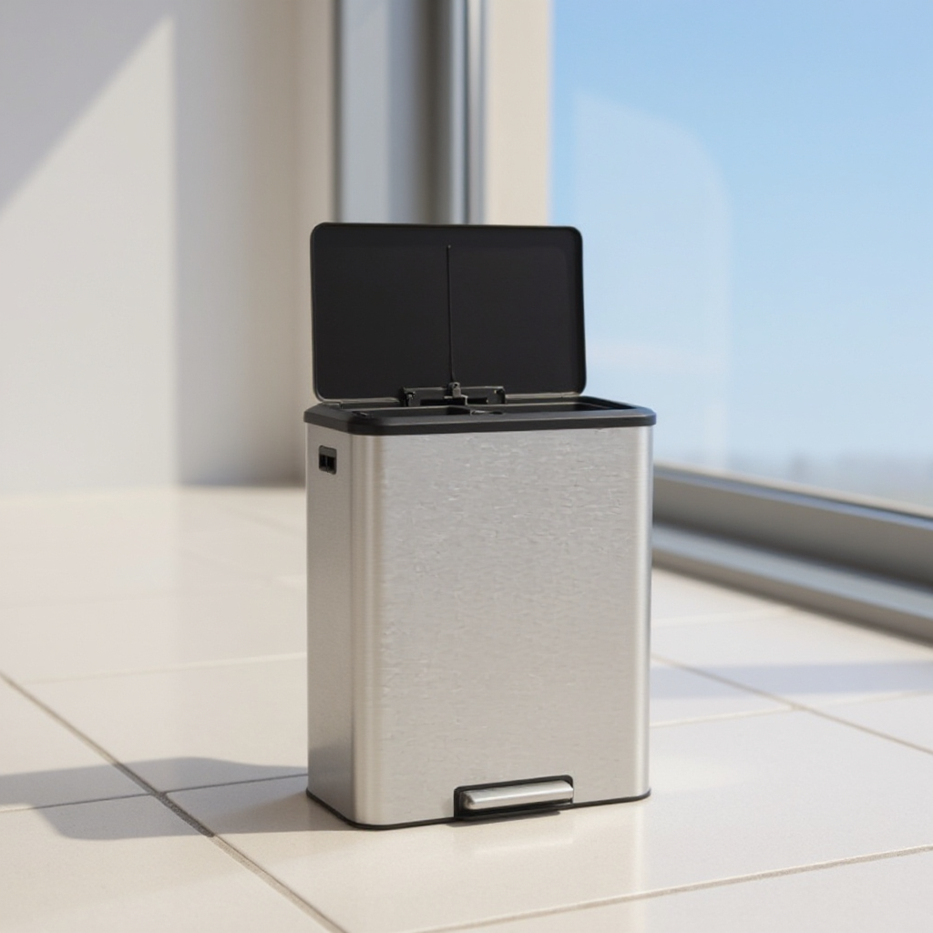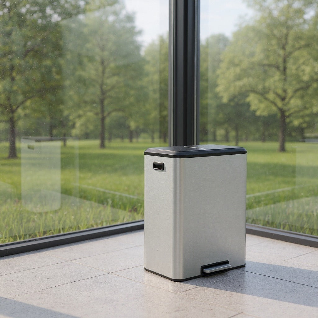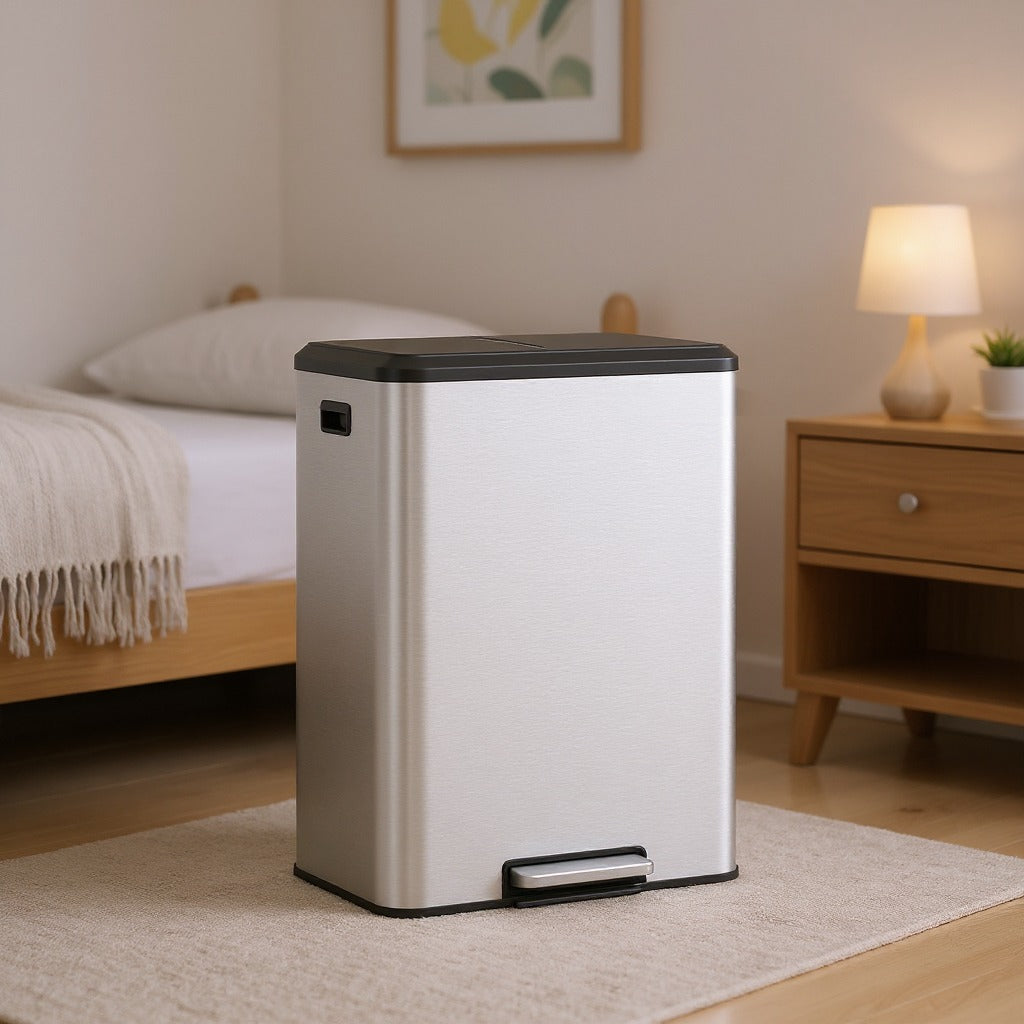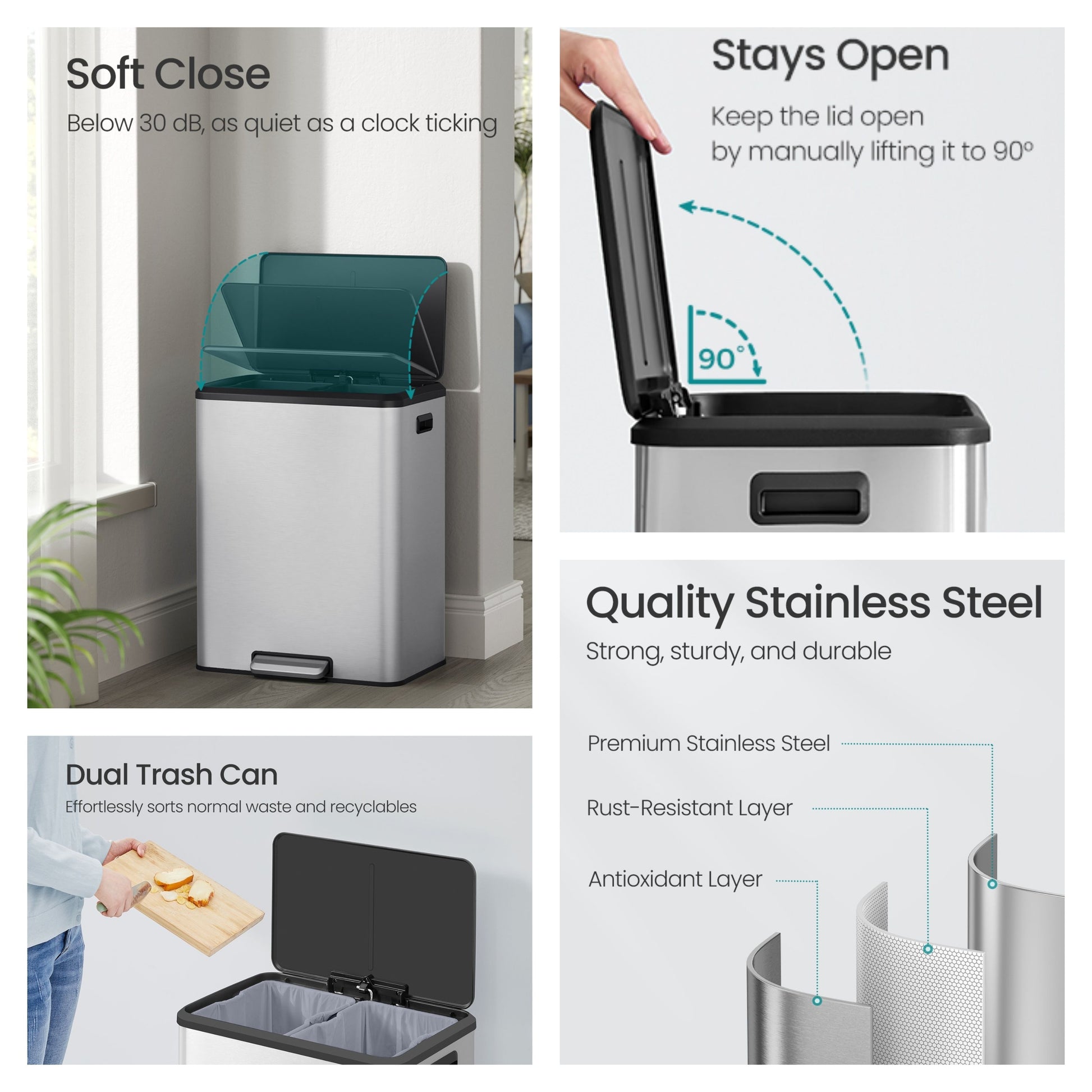 2 x 8 Gal Dual Compartment Step Trash Can, Soft-Close Lid, Inner Buckets, Waste Recycling Bin, Stainless Steel,Metallic Silver