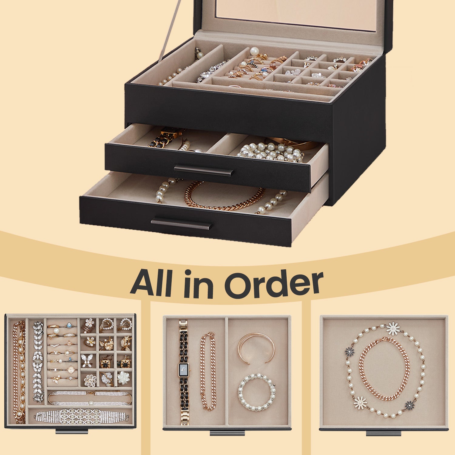 3-Layer Jewelry Box Organizer with Glass Lid & 2 Drawers, Modern PU + MDF Storage Case for Rings, Necklaces, Bracelets ,Graphite Black,Silver