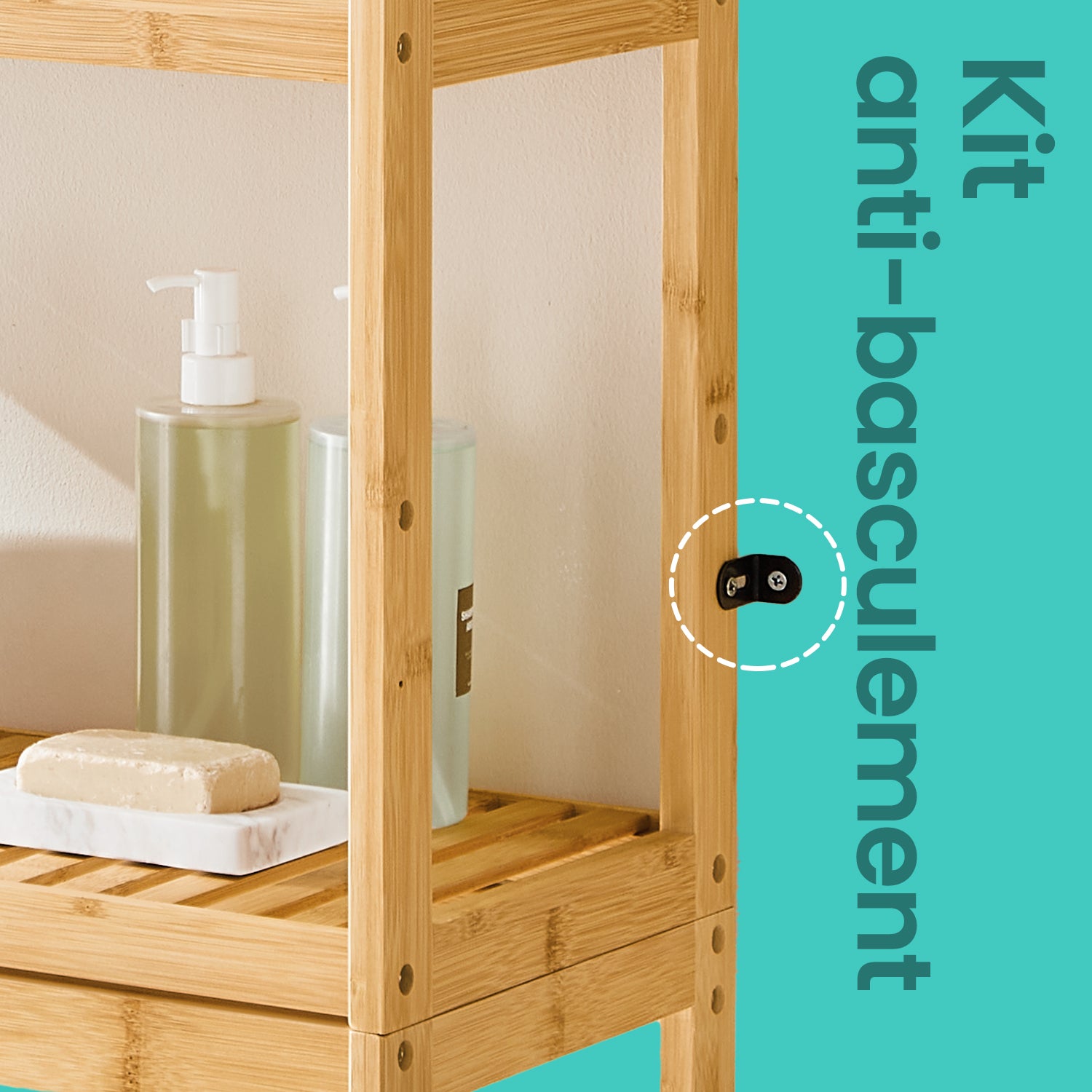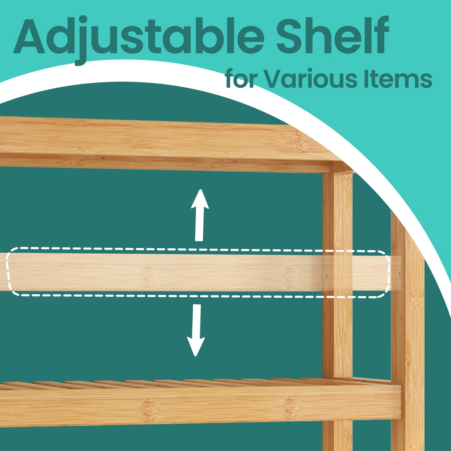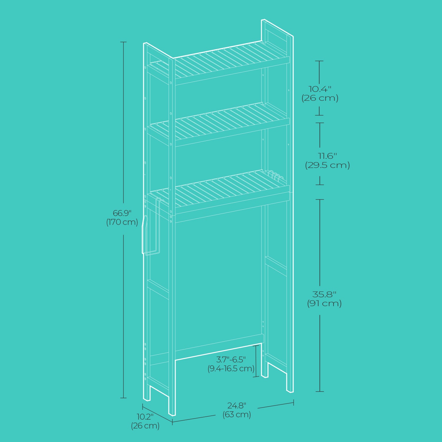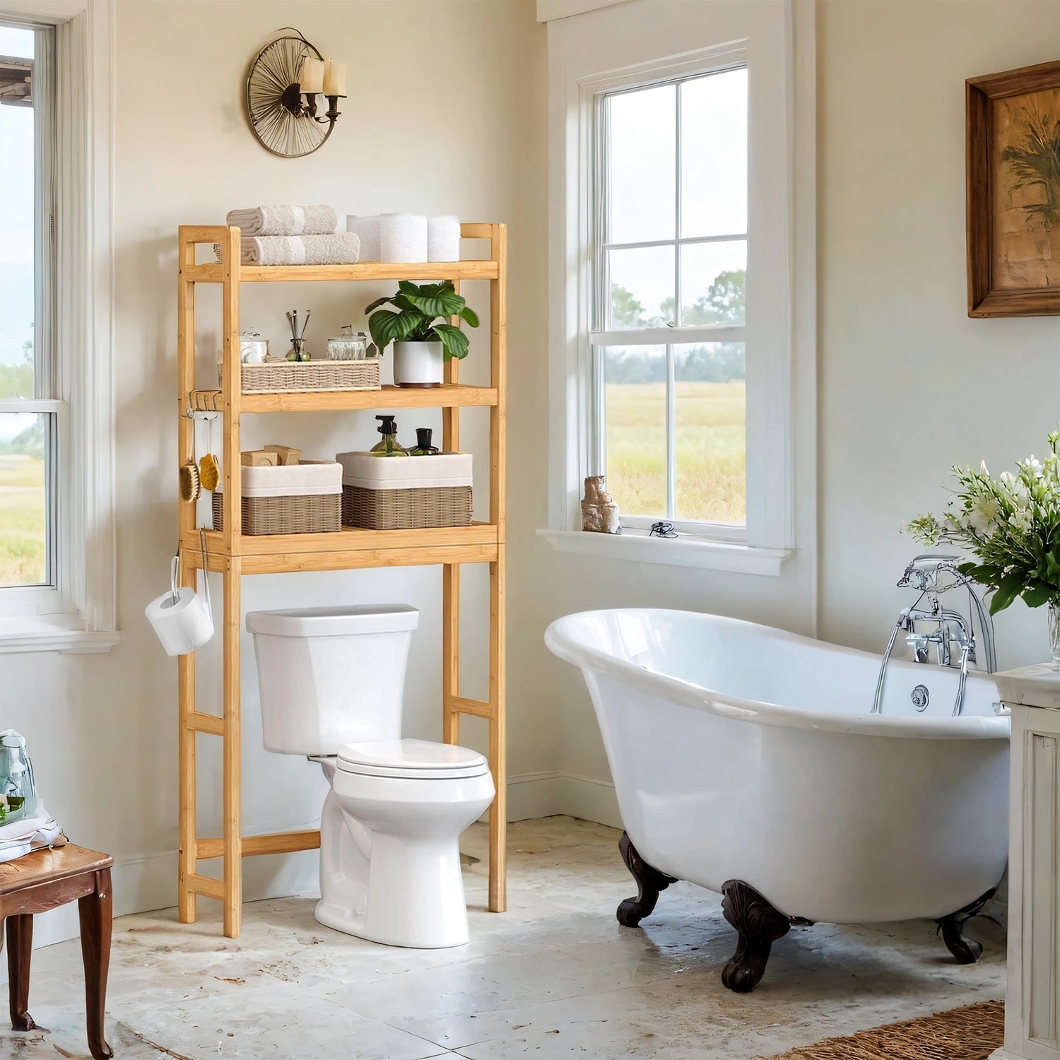 3-Tier Over-The-Toilet Bamboo Shelf Organizer – Adjustable Shelves, Anti-Tip Design, Toilet Paper Holder & Hooks, Space-Saving Bathroom Storage, Natural Beige