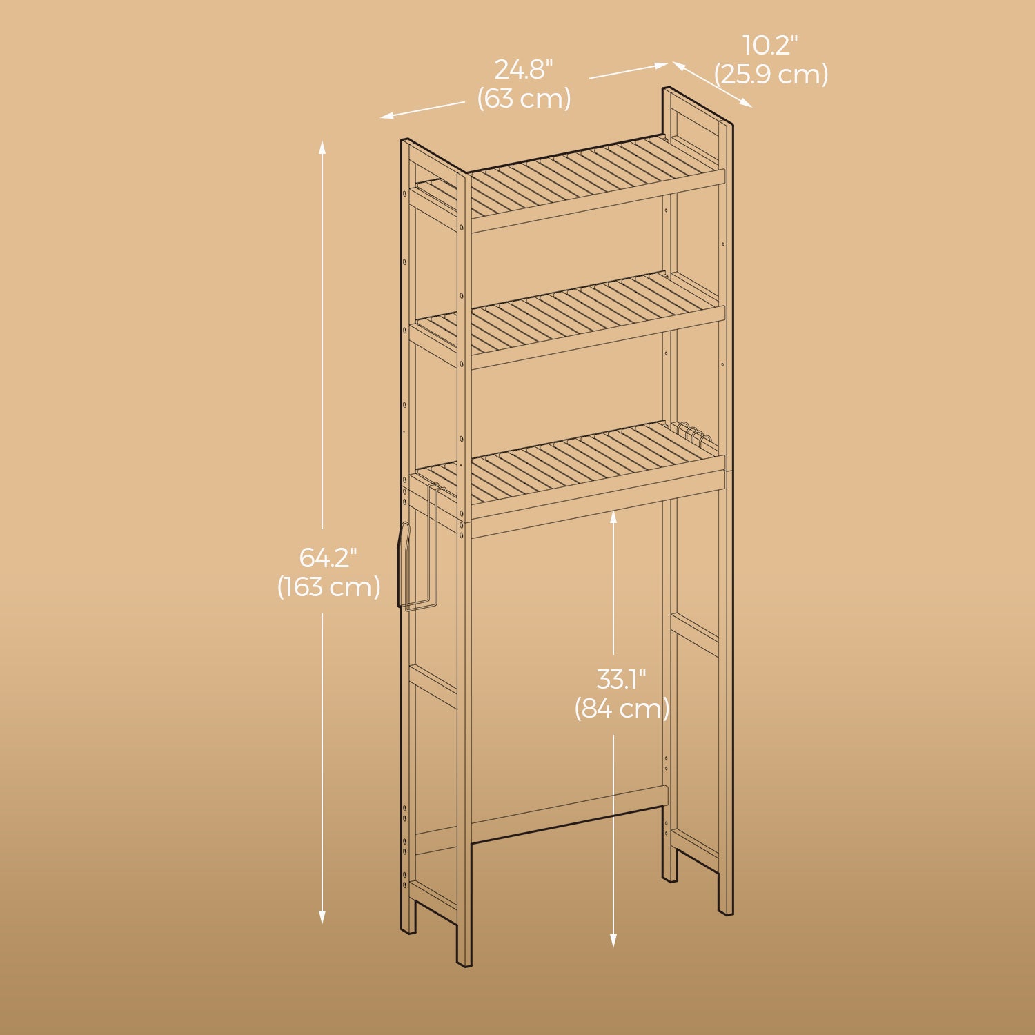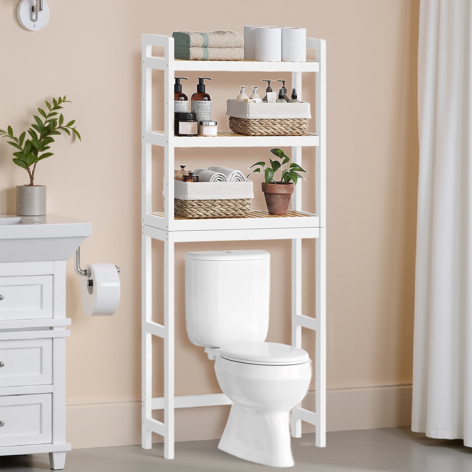 3-Tier Over-The-Toilet Shelf Organizer, Adjustable Bamboo Storage with Hooks & TP Holder, Space-Saving Design for Bathroom, Cloud White , Natural Beige