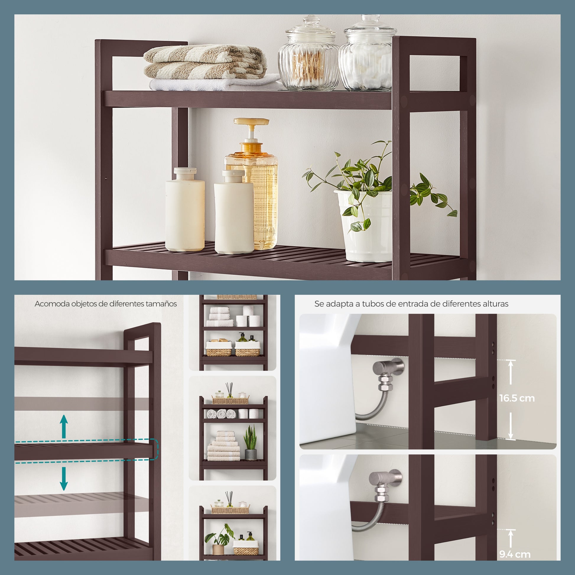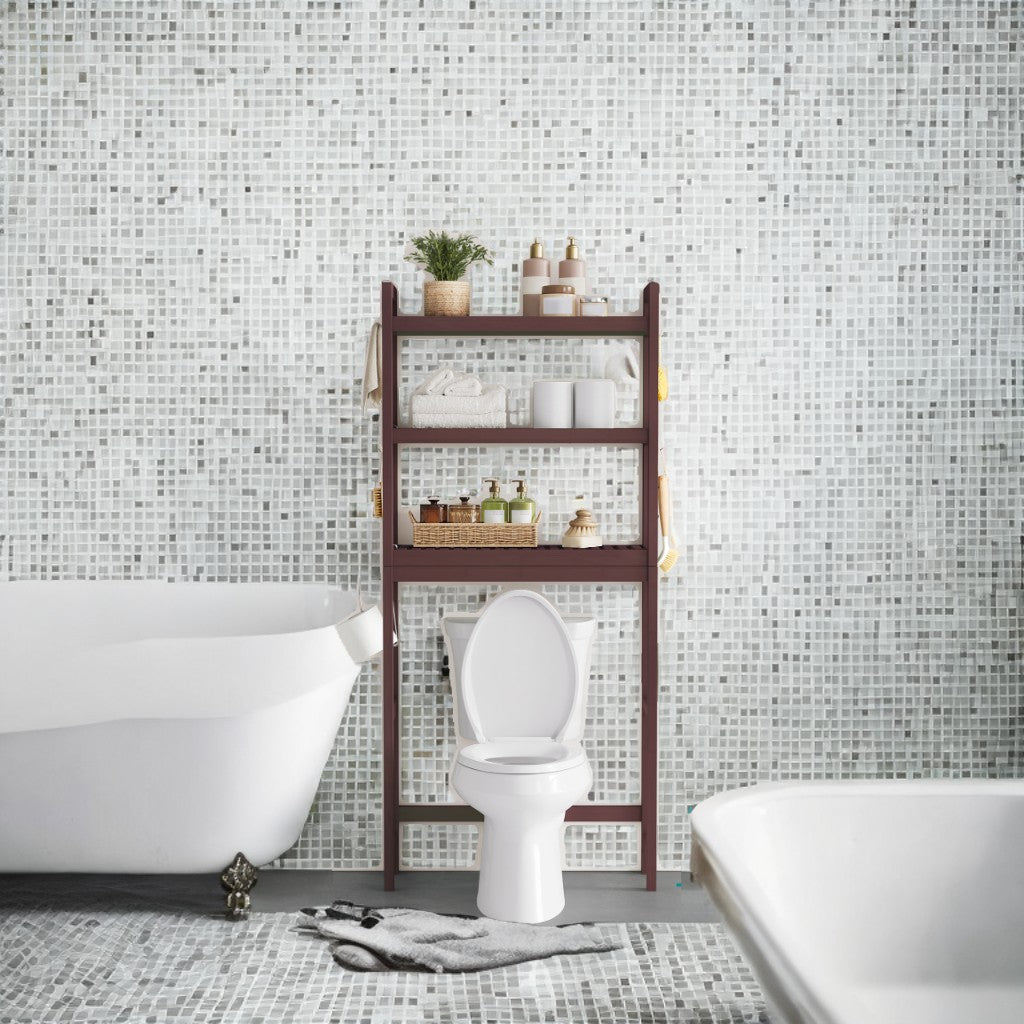 3-Tier Over-The-Toilet Storage Shelf with Adjustable Middle Tier, 4 Hooks & TP Holder,Space-Saving Bathroom Organizer for Towels, Toiletries , Brown