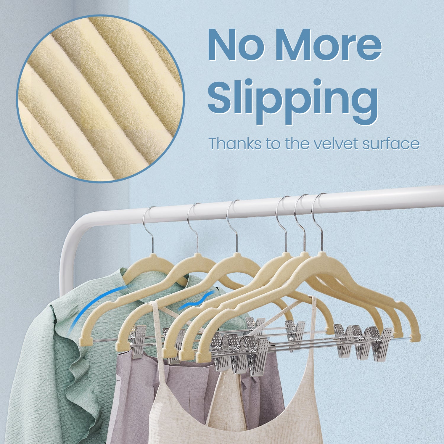 30-Pack Adjustable Non-Slip Velvet Hangers for Pants, Skirts & Dresses – Heavy-Duty Space-Saving Clothes Hangers with Movable Clips, Sandy Beige