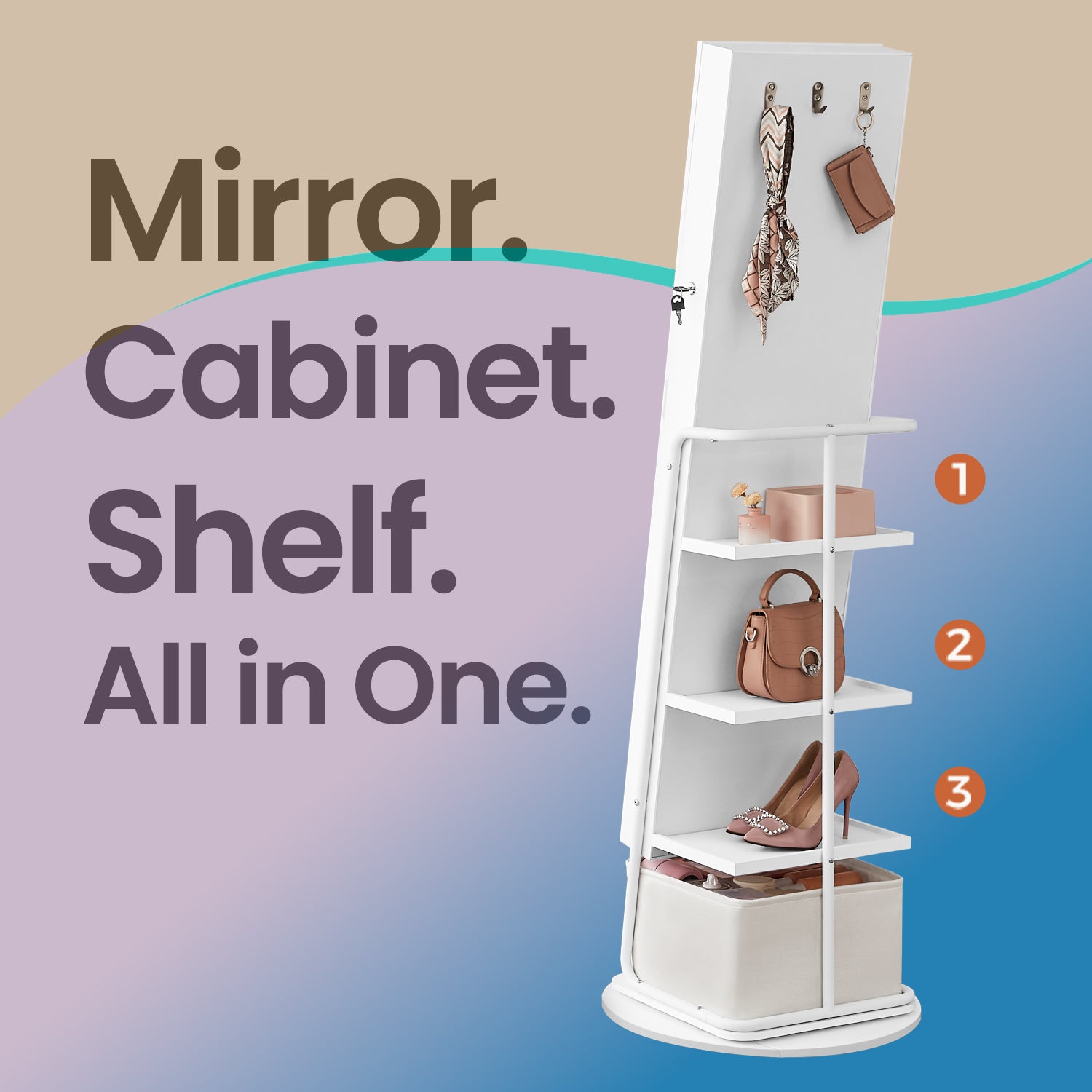 360° Rotating Jewelry Cabinet with LED Lights - Full-Length Mirror, Makeup Station & Storage Organizer, Standing Armoire with Basket, Cloud White