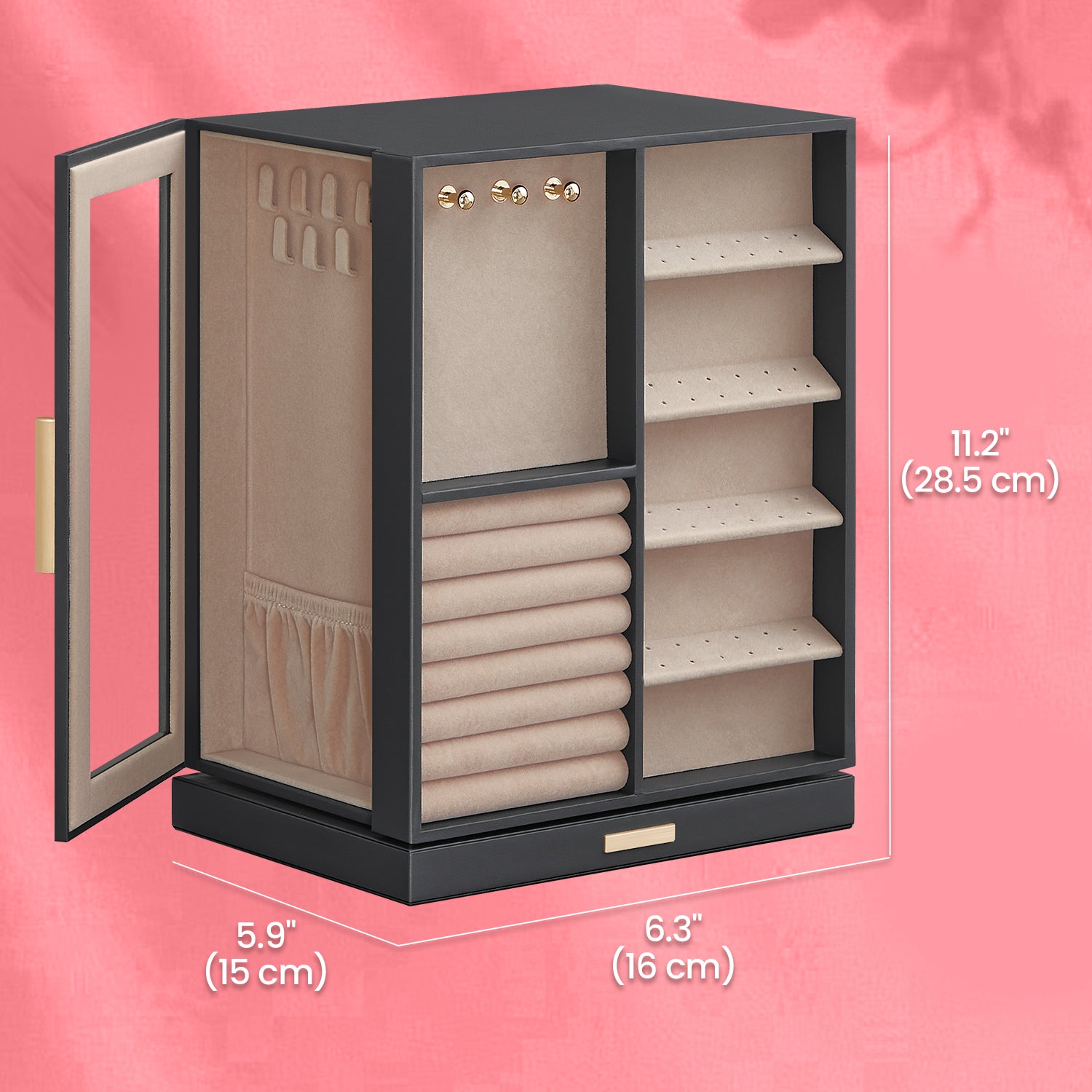 All-in-One Jewelry Organizer – Store rings, necklaces, earrings, and more in dedicated slots, hooks, and 5 spacious drawers—keeping every piece neatly sorted and within reach.