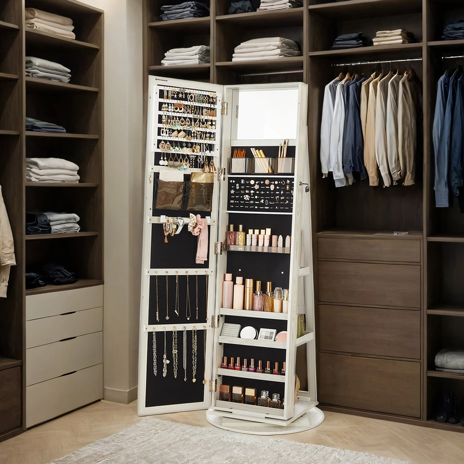 360° Swivel Lockable Jewelry Armoire with Full-Length Mirror, 120 Earring Slots, 12 Necklace Hooks, 78 Ring Slots, Rear Shelves & Interior Mirror,White