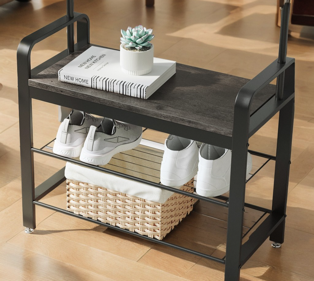 4-in-1 Entryway Hall Tree with Shoe Bench, 9 Hooks, Hanging Rod, Heavy-Duty Coat Rack for Entry Storage, Charcoal Gray and Black