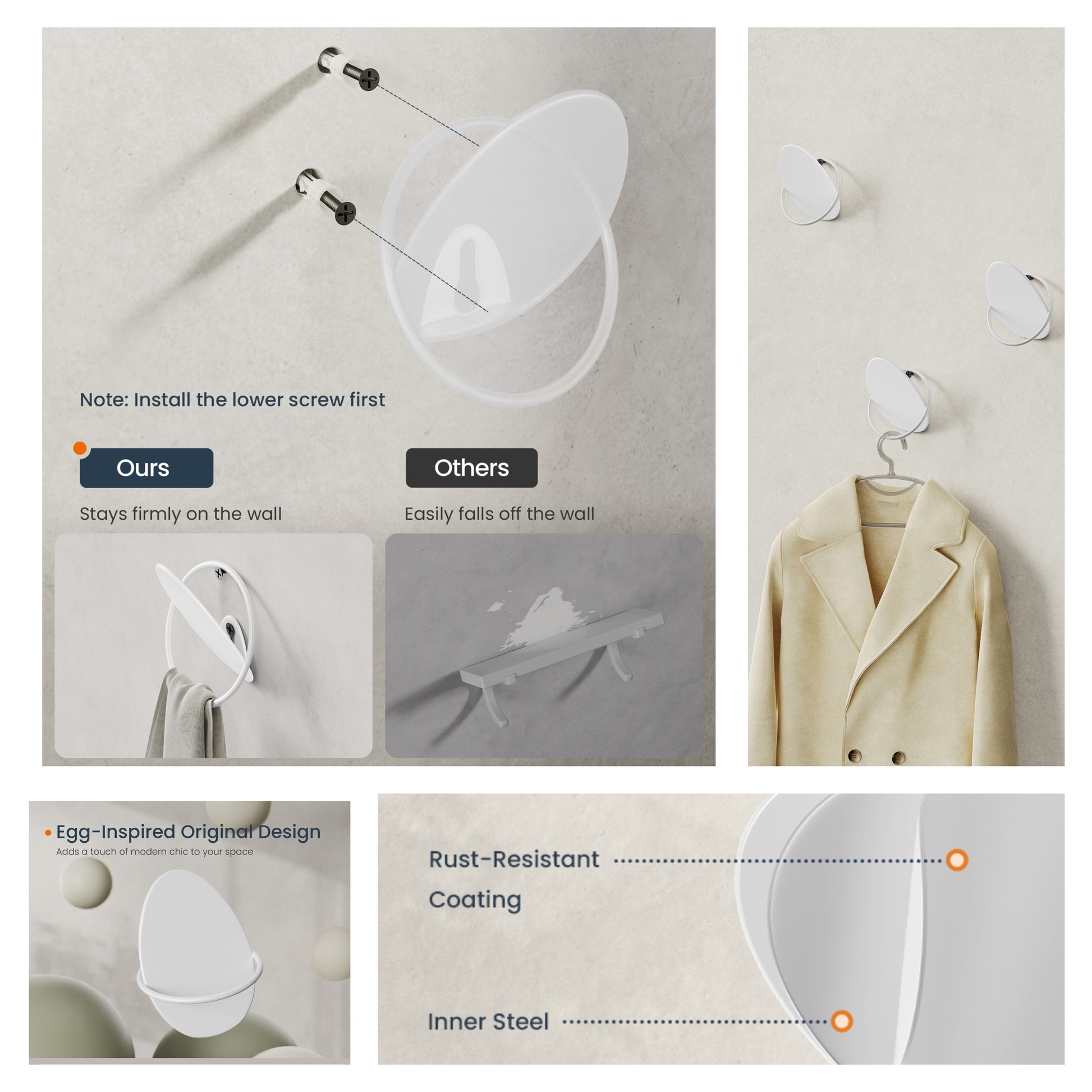 4-Pack Egg Design Wall Hooks - Modern Coat Hooks for Entryway, Bedroom & Bathroom, 11lb Capacity Each, Pearl White