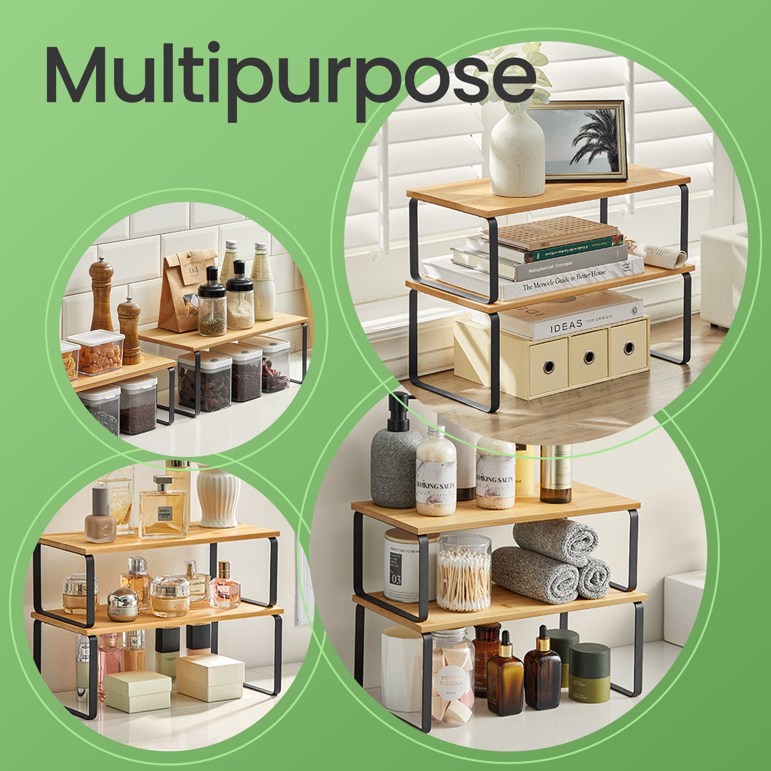 4-Pack Kitchen Organizer Shelves - Stackable, 33lb Capacity, Adjustable Storage Rack, Metal/Wood, Ink Black and Natural Beige