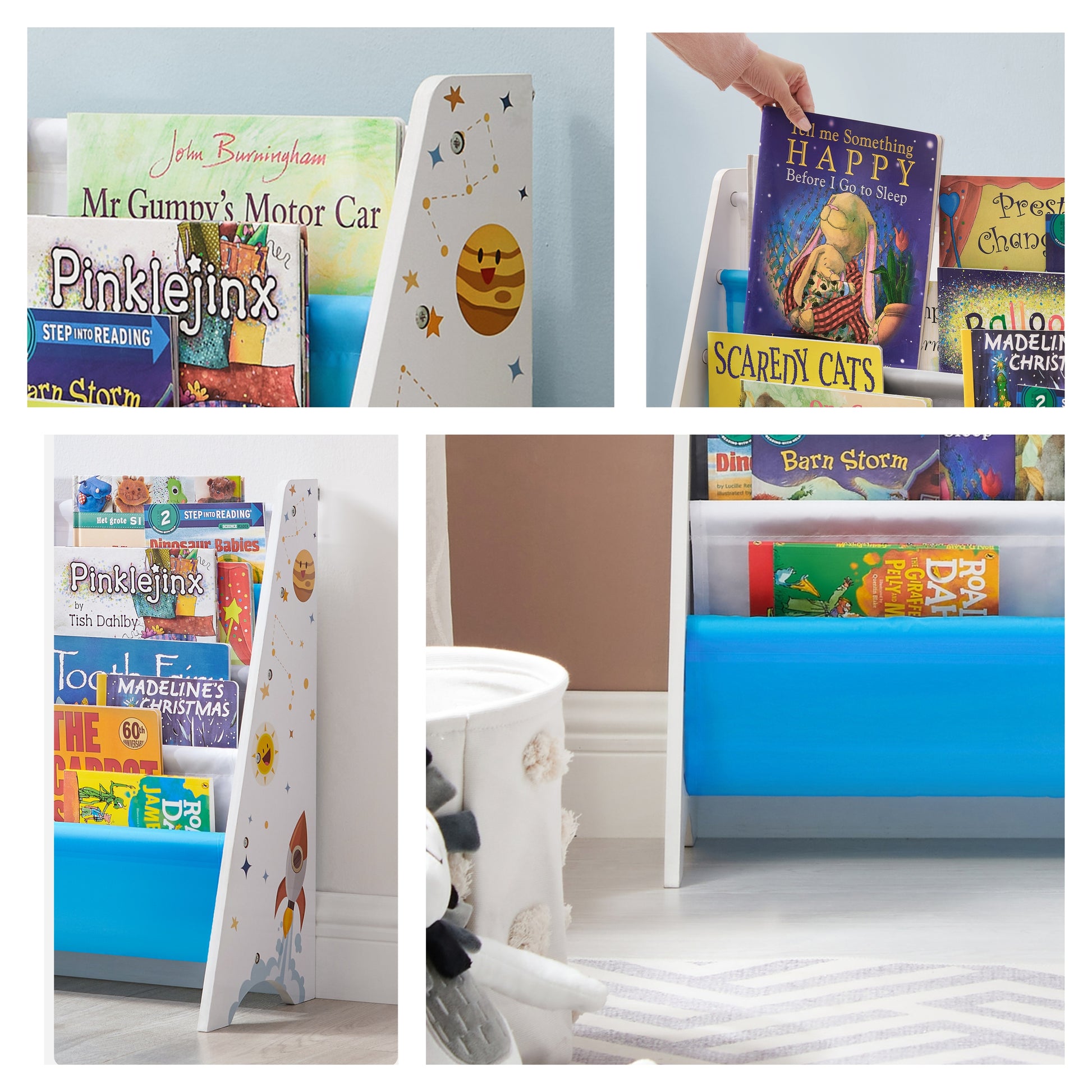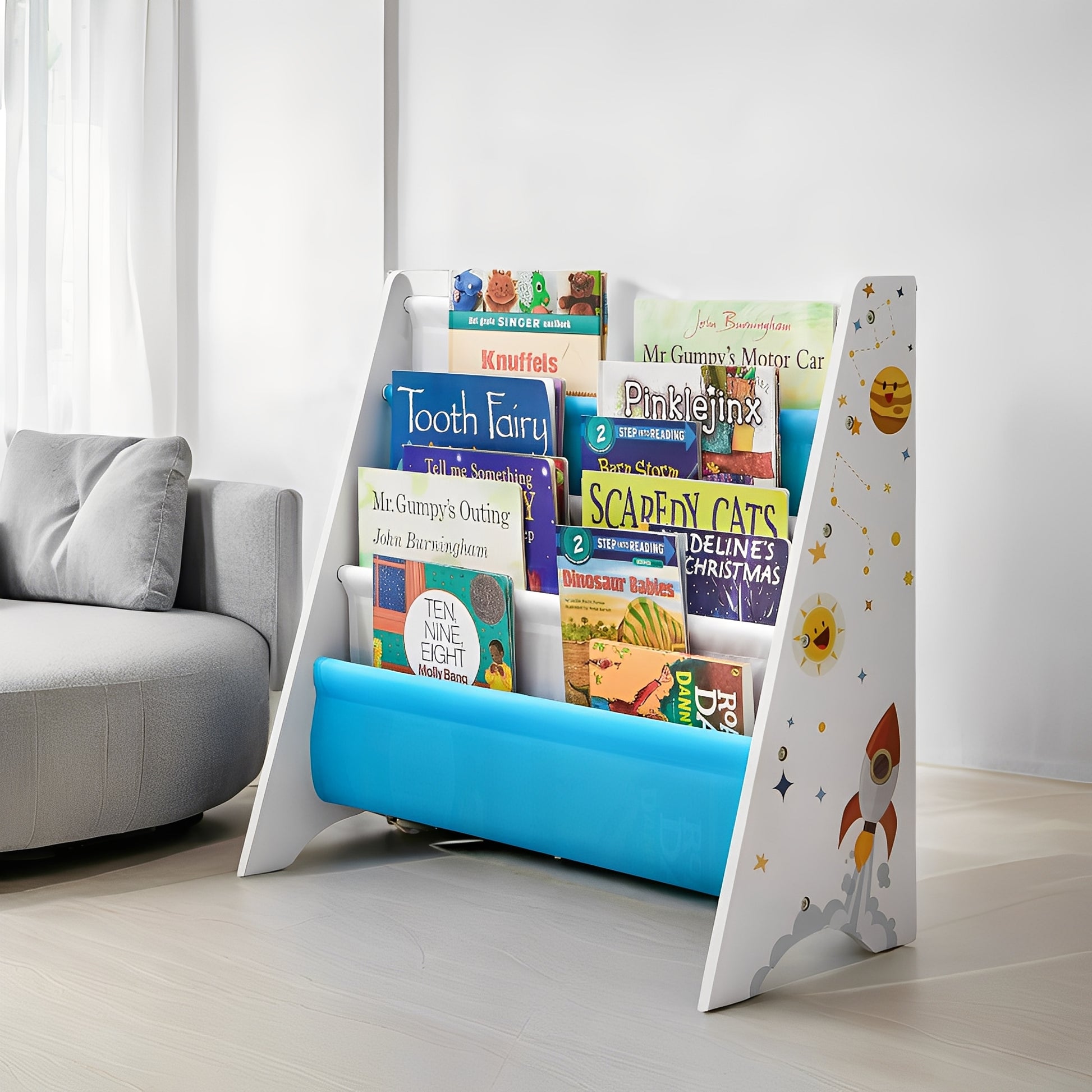4-Tier Kids Bookcase with Anti-Tip Kit, Space-Saving Bookshelf Organizer for Children's Room, Playroom, Nursery,White, Blue and Gray