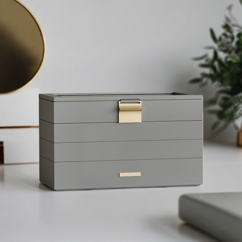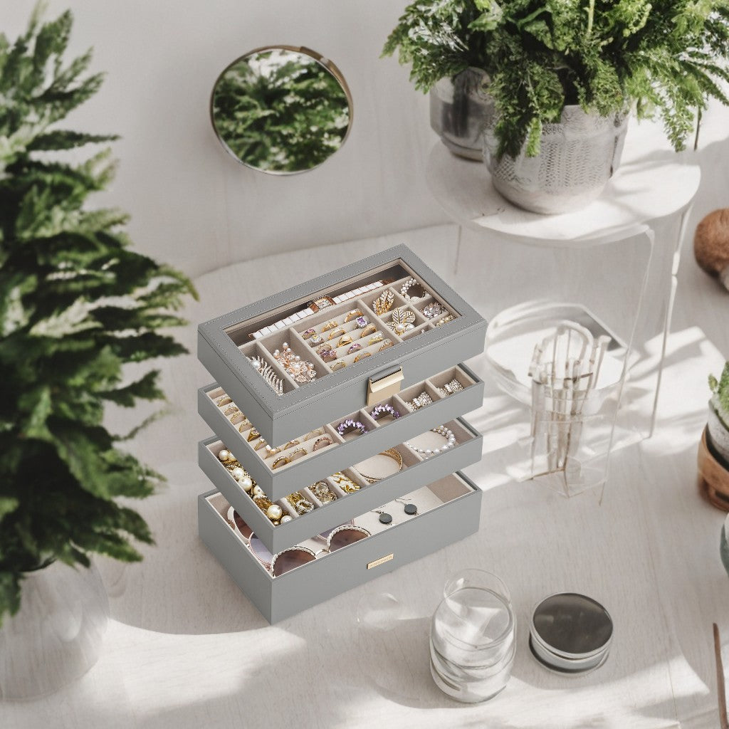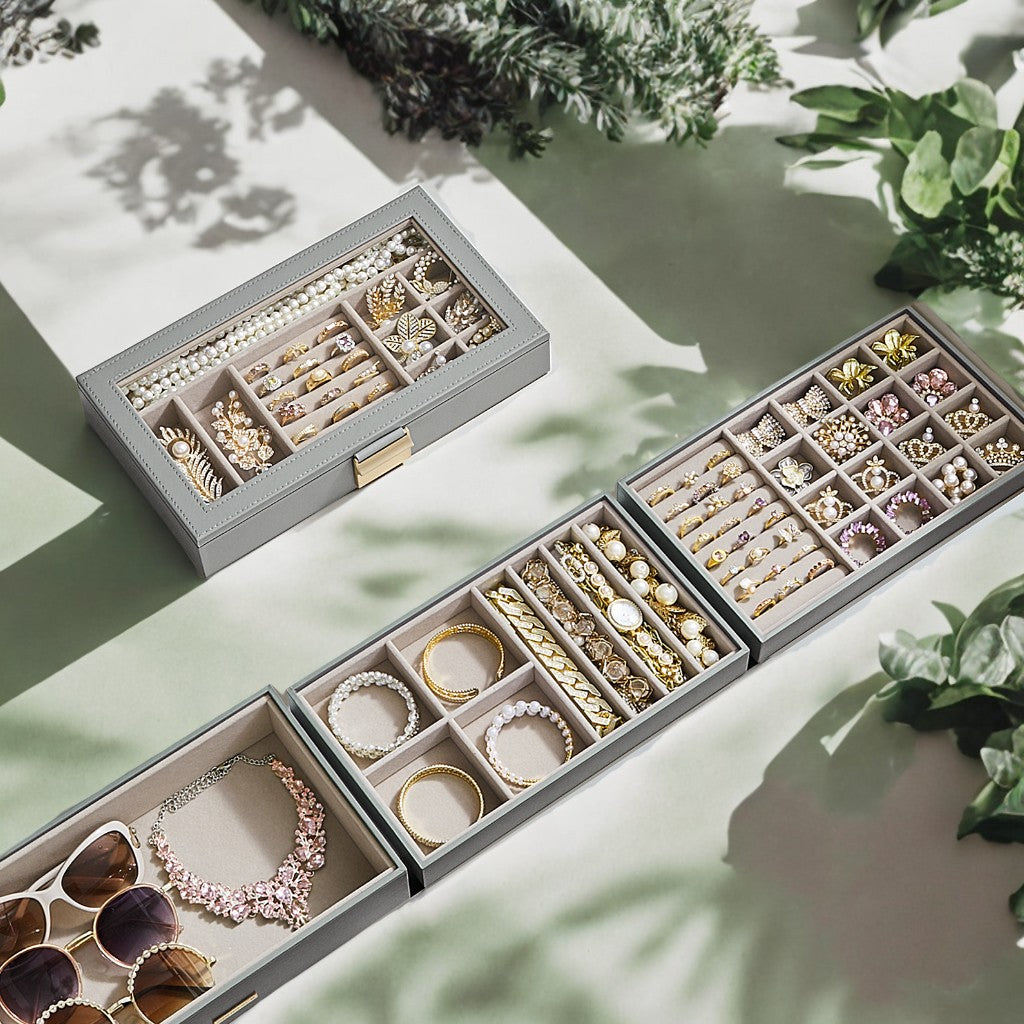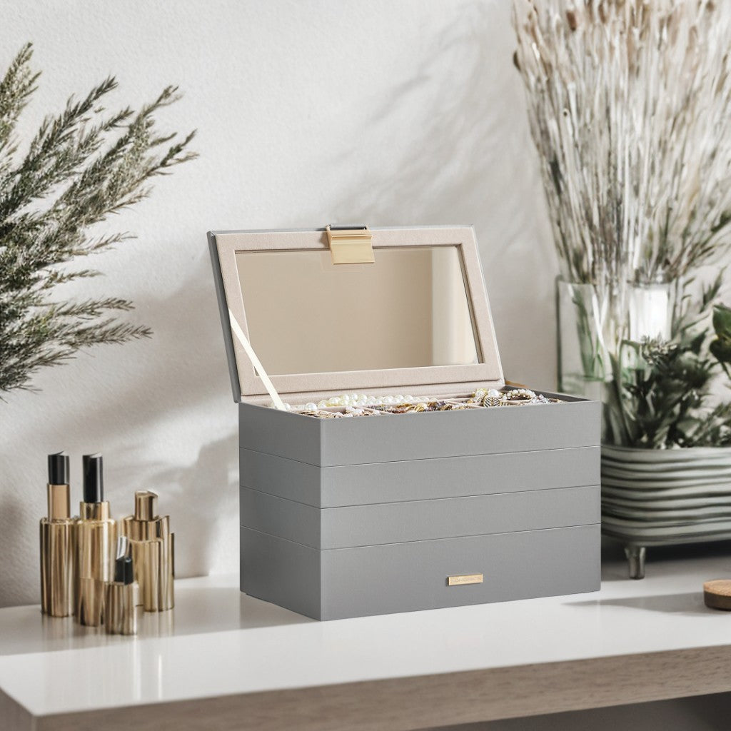 4-Tier Modular Jewelry Organizer with Glass Lid & Adjustable Trays, Stackable Drawer Storage for Vanity/Closet, Gift Ready, Dove Gray