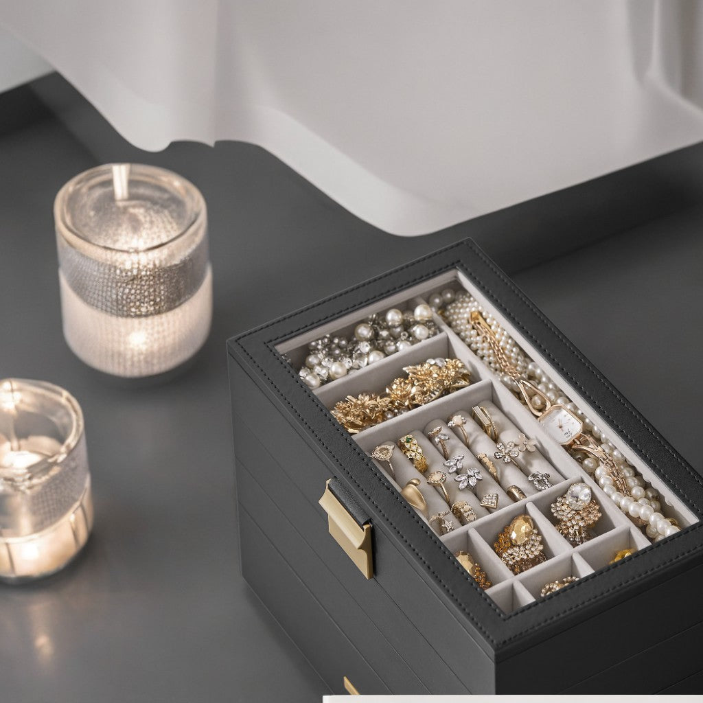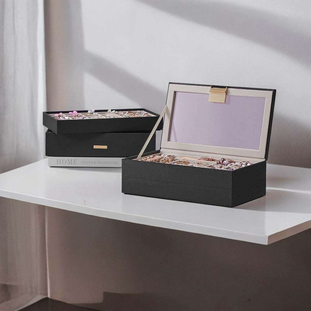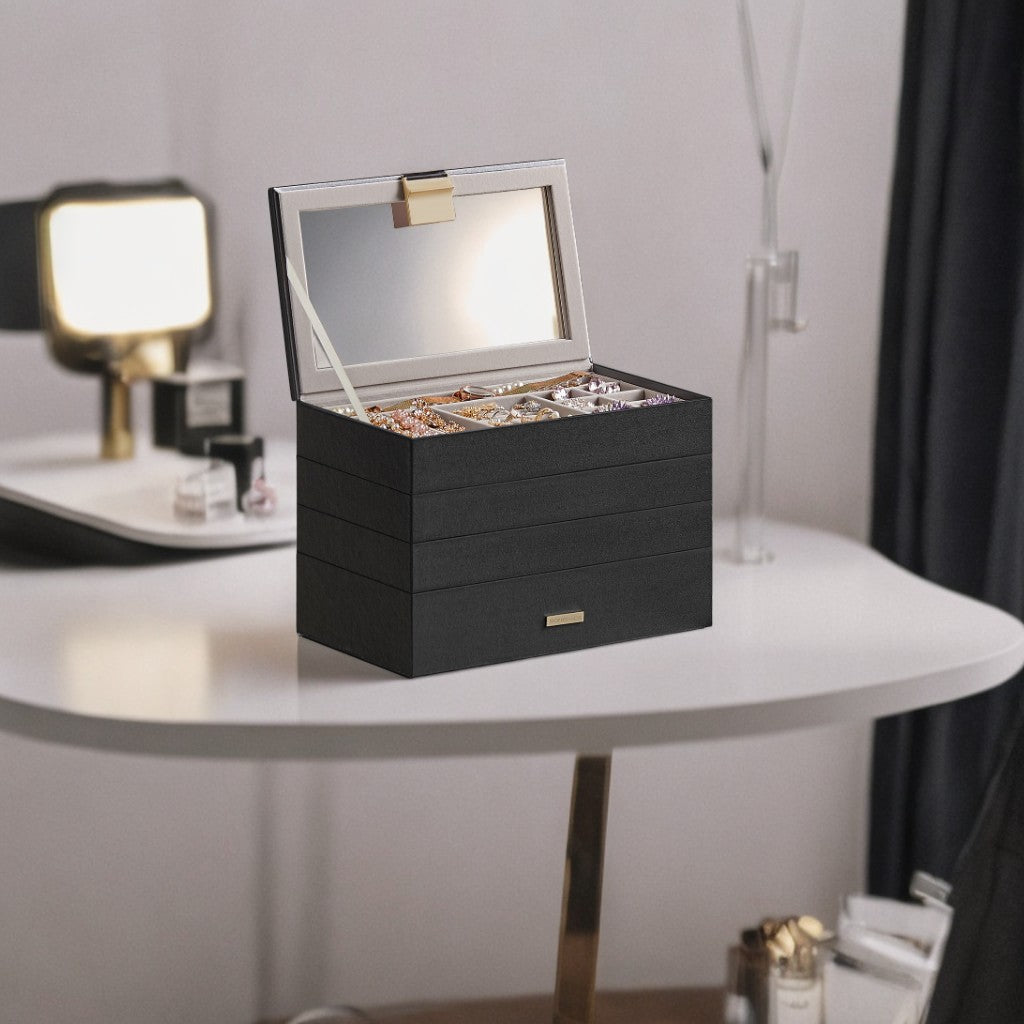 4-Tier Stackable Jewelry Organizer with Glass Lid, Adjustable Dividers, Modular Drawers for Vanity/Dresser, Gift Ready, Ink Black