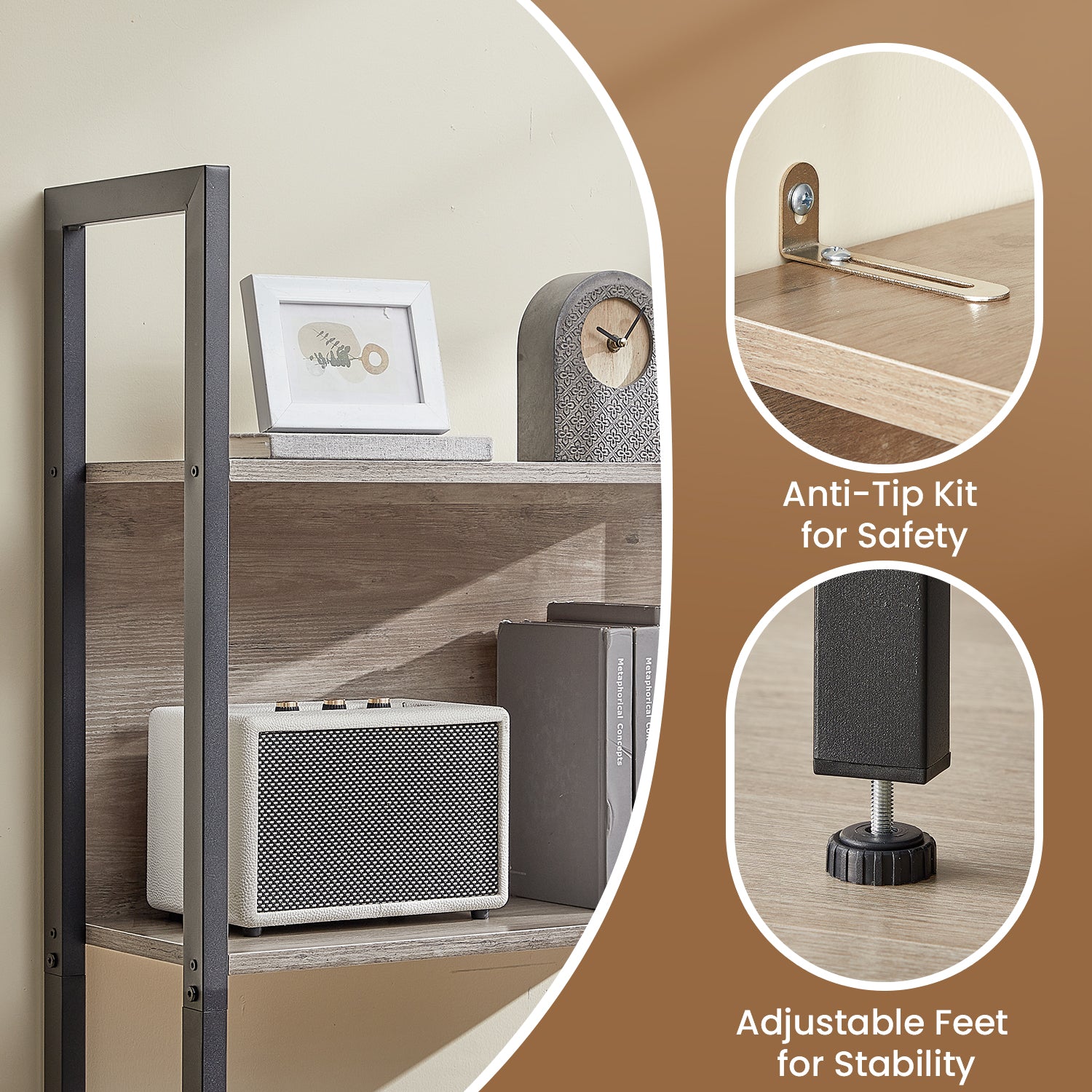 5-Tier Industrial Bookshelf - Steel Frame, 44lb Capacity, Anti-Tip Kit, Multi-Purpose Storage for Home or Office, Easy Assembly, Greige and Black