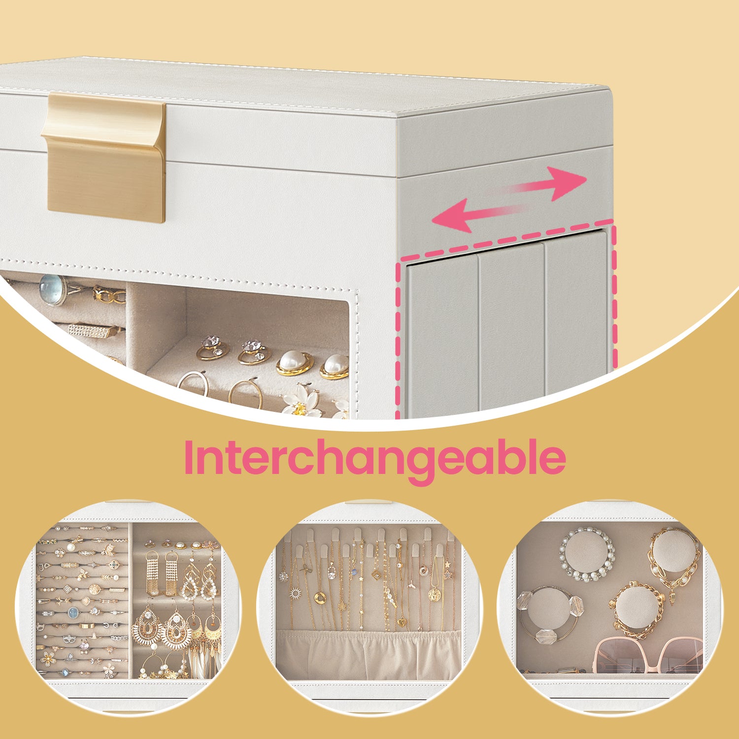 5-Tier Jewelry Organizer with Glass Display & 3 Modular Drawers, Hanging Storage System with Full Mirror, Modern Jewelry Case, Cloud White and Metallic Gold