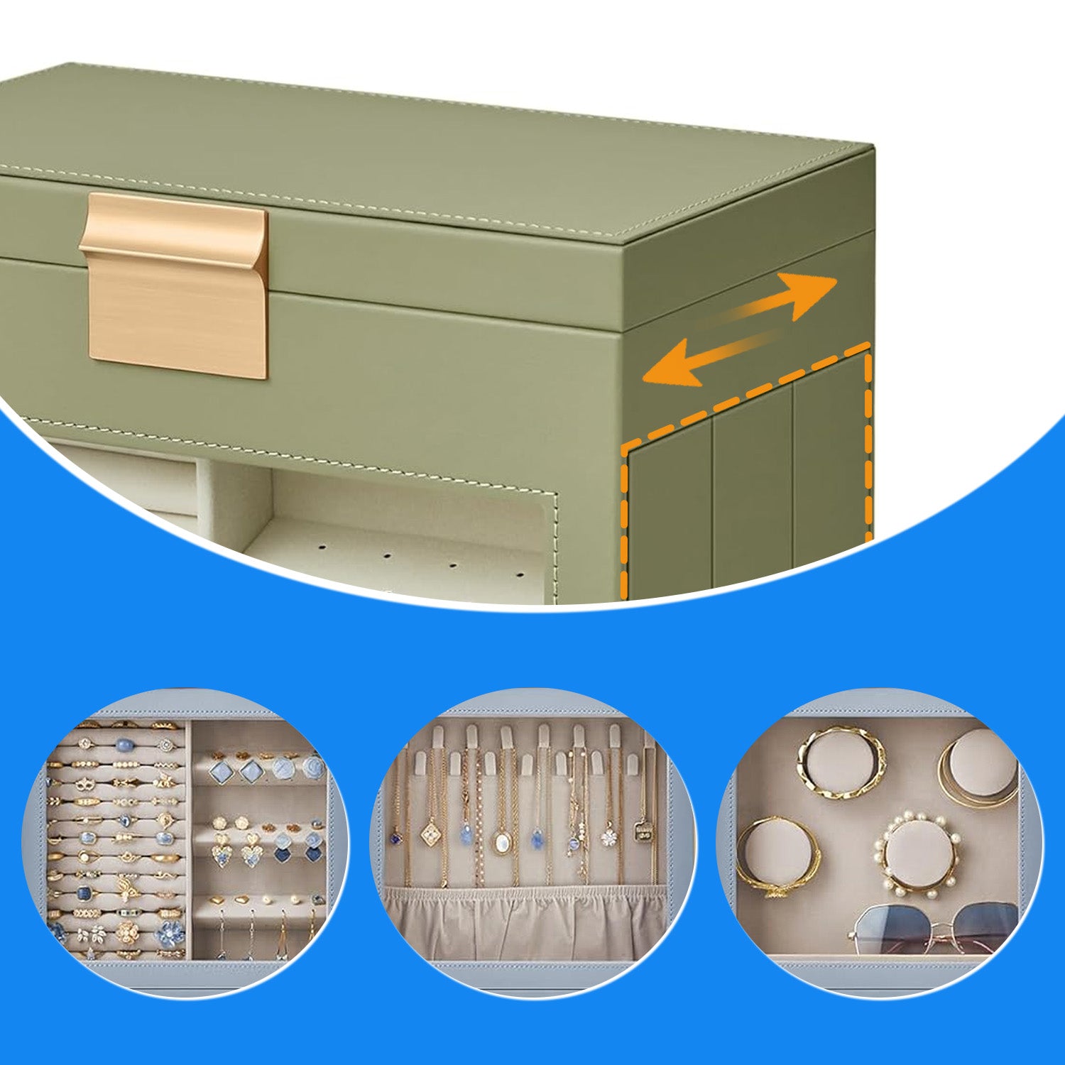 5-Tier Jewelry Organizer with Glass Display & 3 Modular Drawers, Hanging Storage System with Full Mirror, Modern Jewelry Case, Sage Green and Metallic Gold