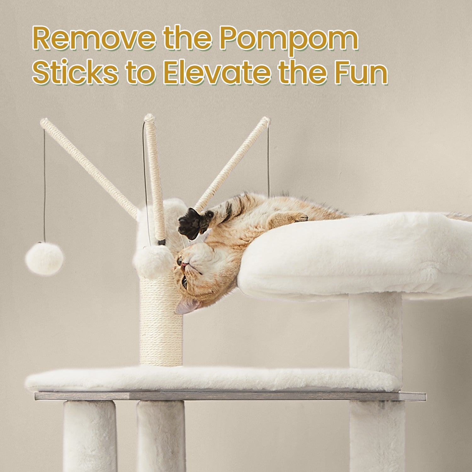 55.1-Inch 2-in-1 Cat Tree, Litter Box Enclosure, Modern Cat Tower with Scratching Posts, Removable Pompoms, Space-Saving Design, Greige