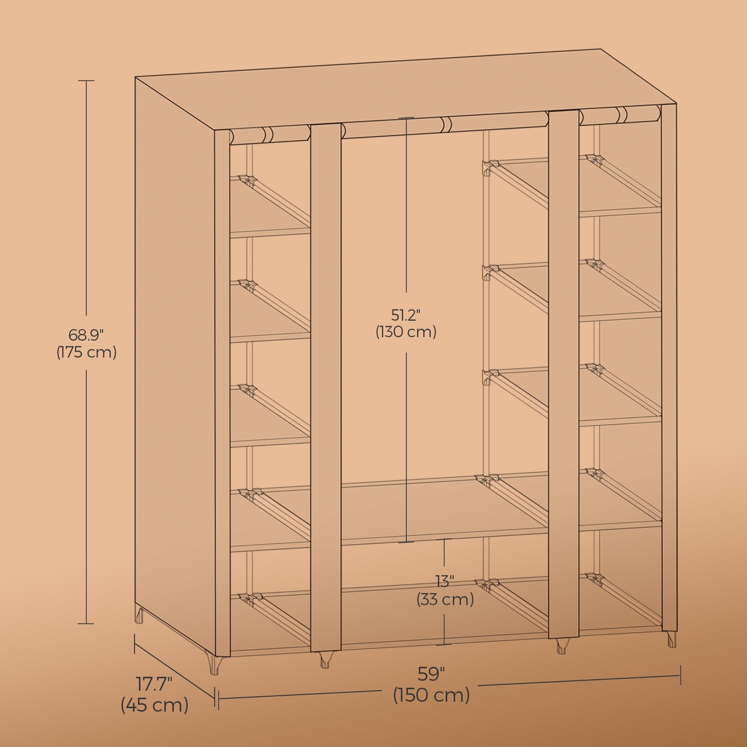 59-Inch Portable Closet, 12-Compartment Wardrobe with Zippered Cover & Hanging Rail, No-Tool Assembly Storage Organizer, Black