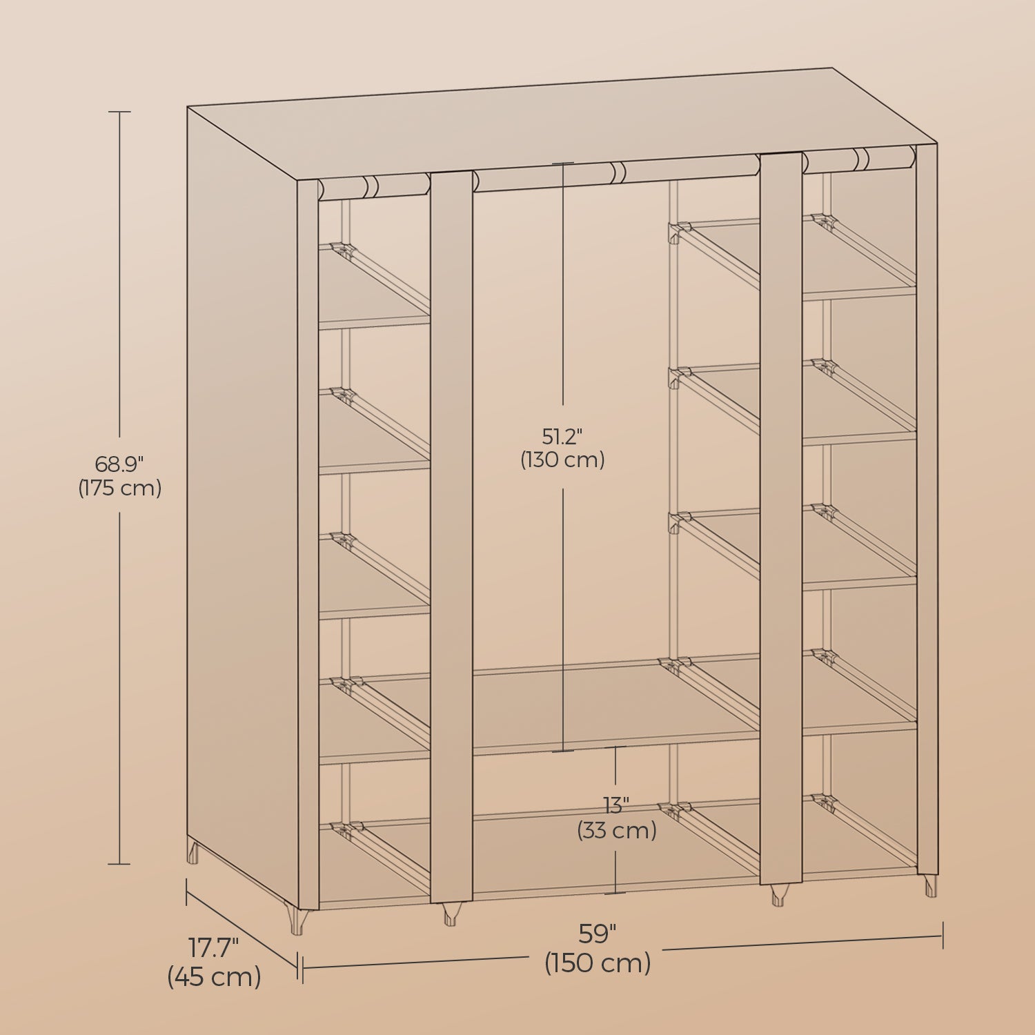 59-Inch Portable Closet, 12-Compartment Wardrobe with Zippered Cover & Hanging Rail, No-Tool Assembly Storage Organizer, Gray
