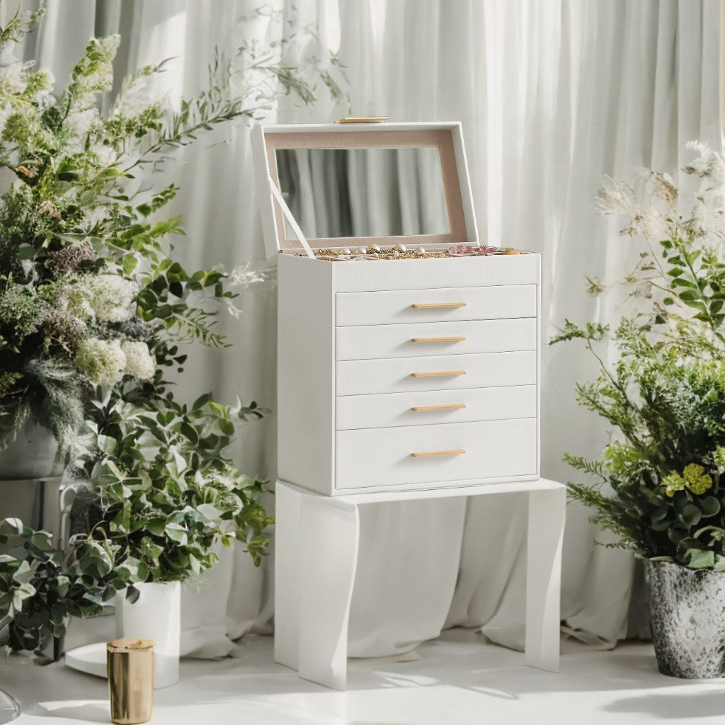 6-Layer Jewelry Organizer with Glass Lid & 5 Drawers, Modern Velvet-Lined Storage Box for Dresser/Vanity, Cloud White and Gold Color