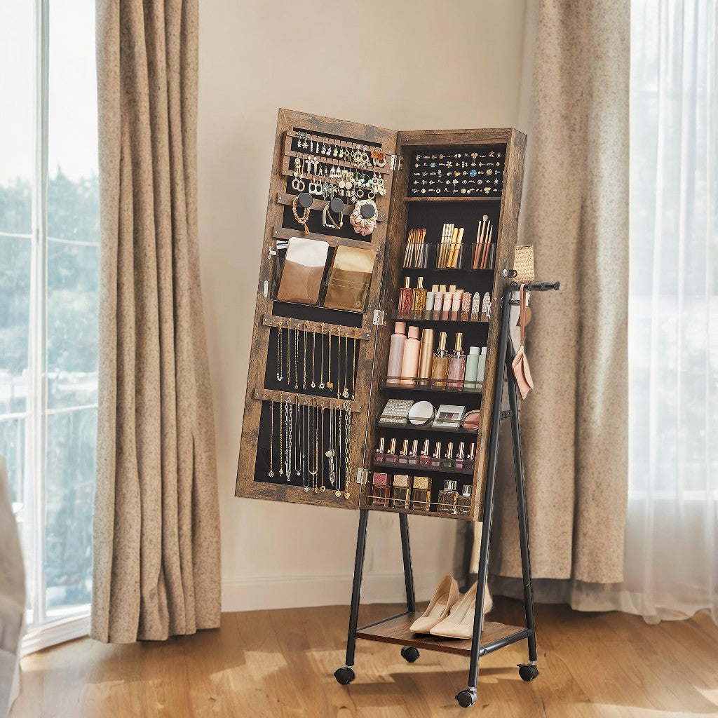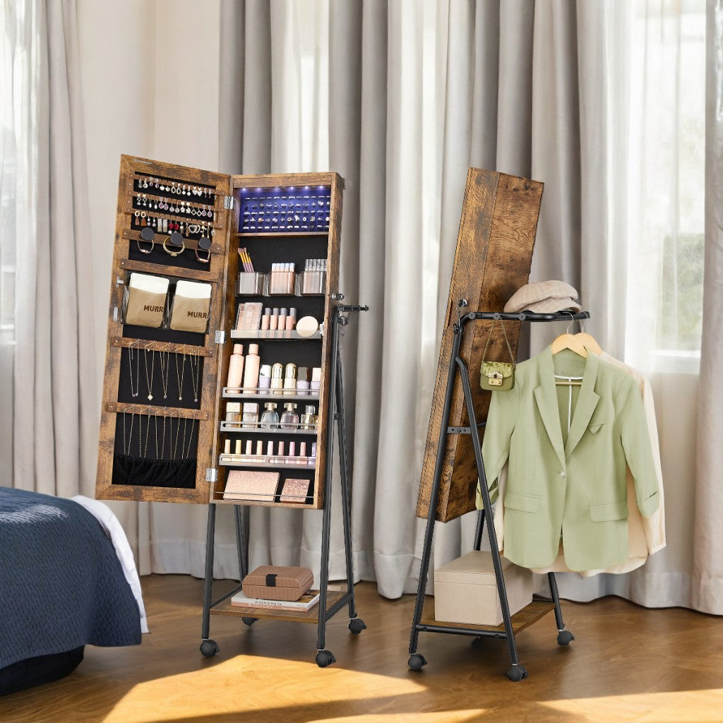 6-LED Lockable Jewelry Armoire with Mirror, 4 Wheels & Coat Rack – 45 Earring Slots, 60 Ring Holders, Rustic Brown and Black