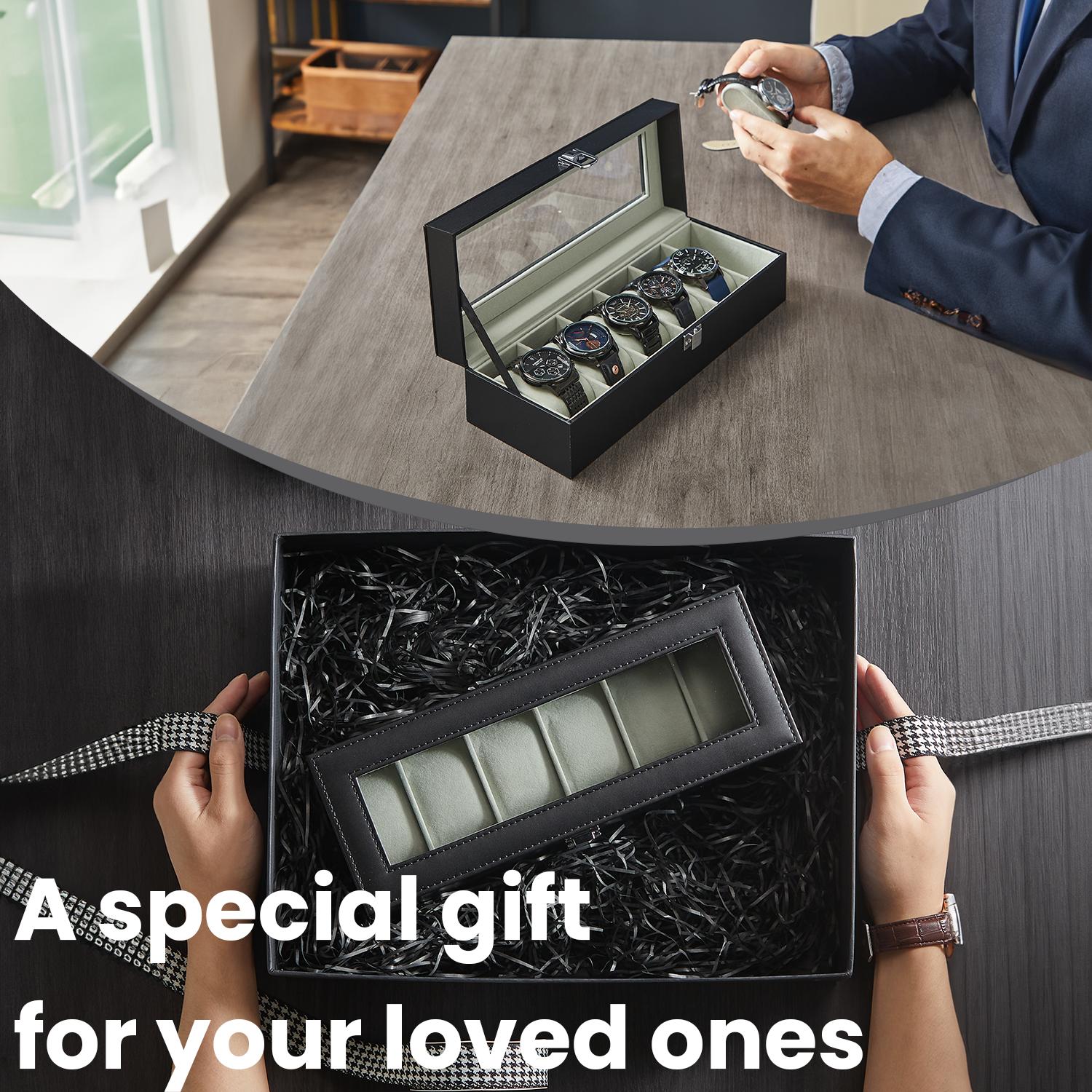 6-Slot Premium Watch Box with Glass Lid, PU Leather Case with Removable Pillows & Velvet Lining, Watch Organizer, Black Synthetic Leather, Gray Lining