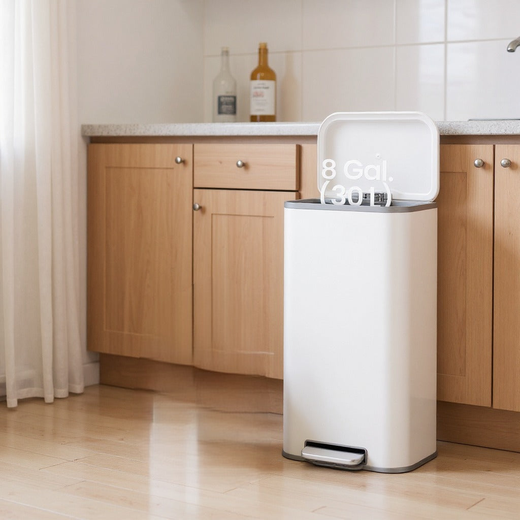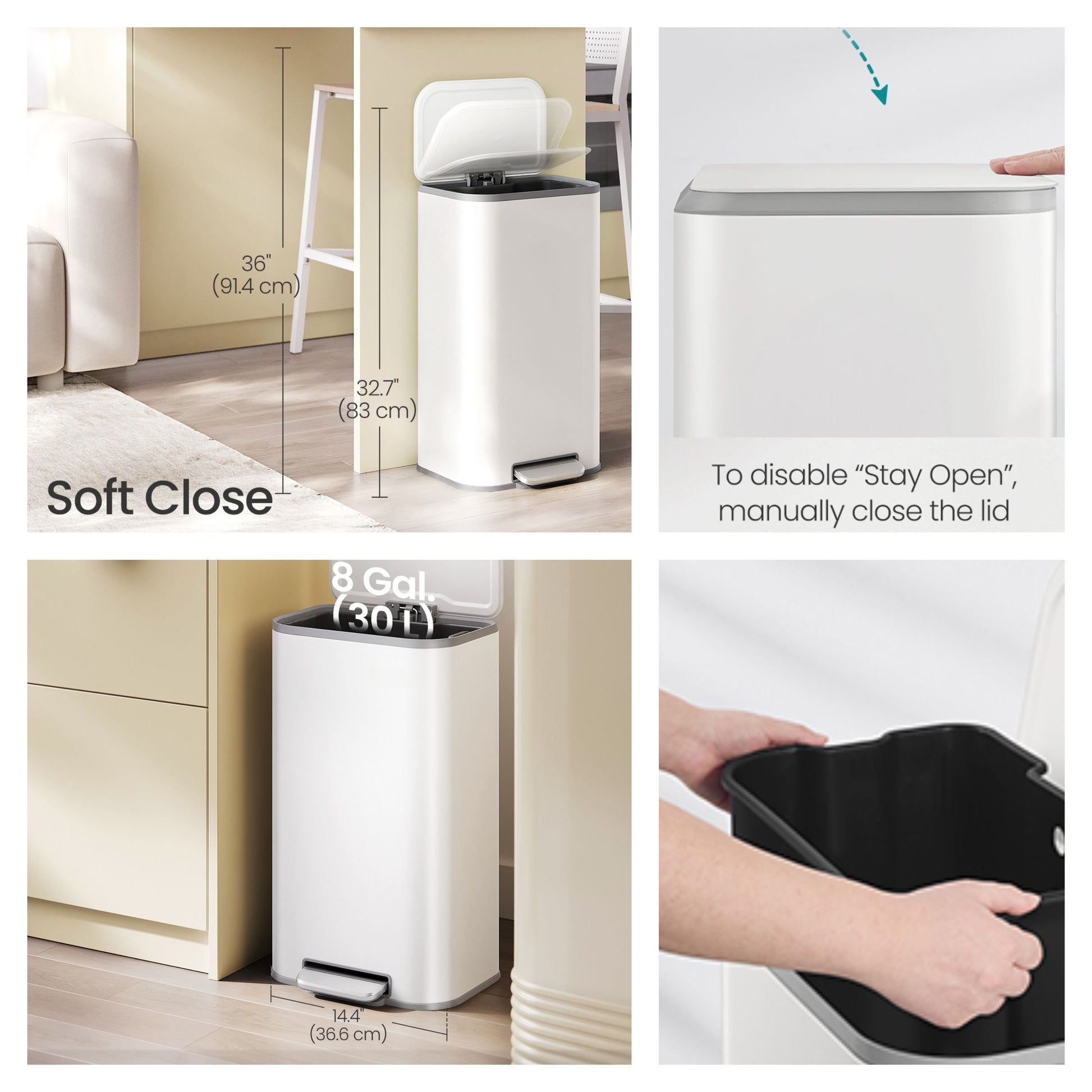 8-Gallon Step Trash Can, Soft-Close Stay-Open Lid, Inner Bucket, Non-Slip Pedal, Compact Stainless Steel Bin for Kitchen,Cloud White