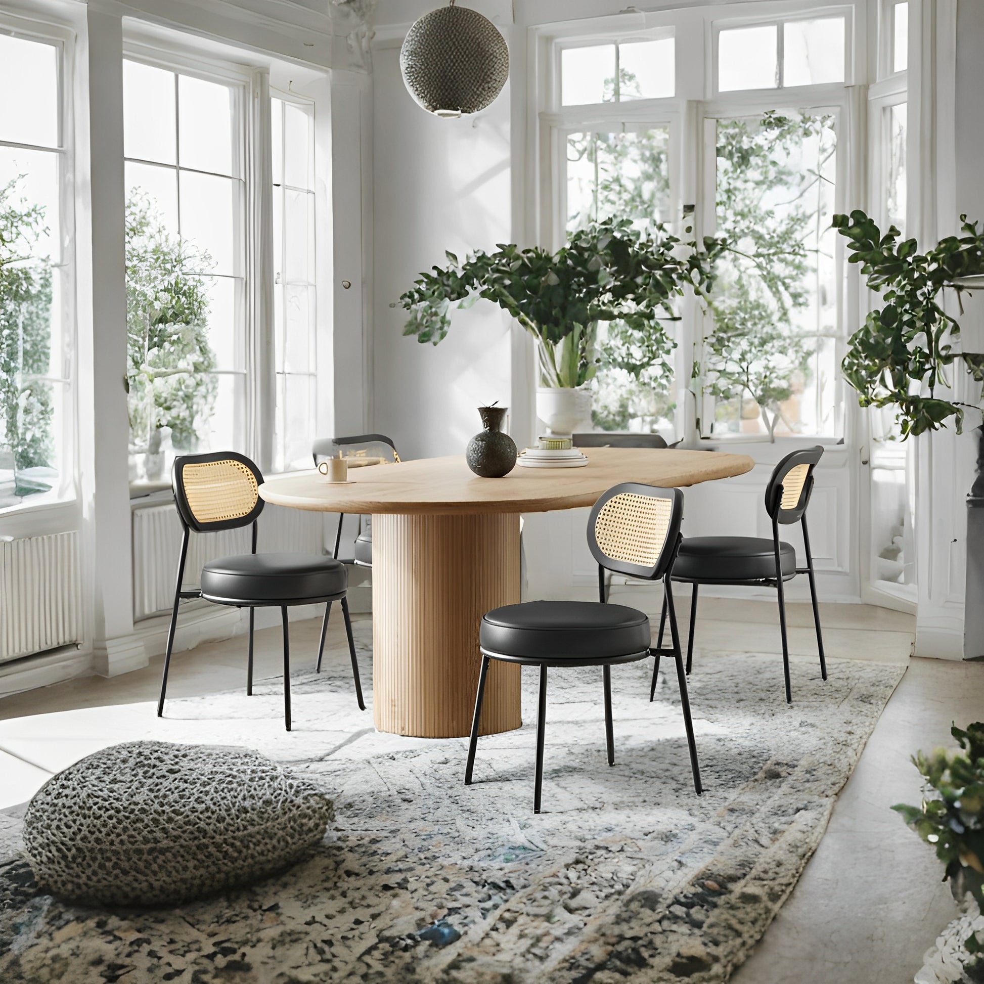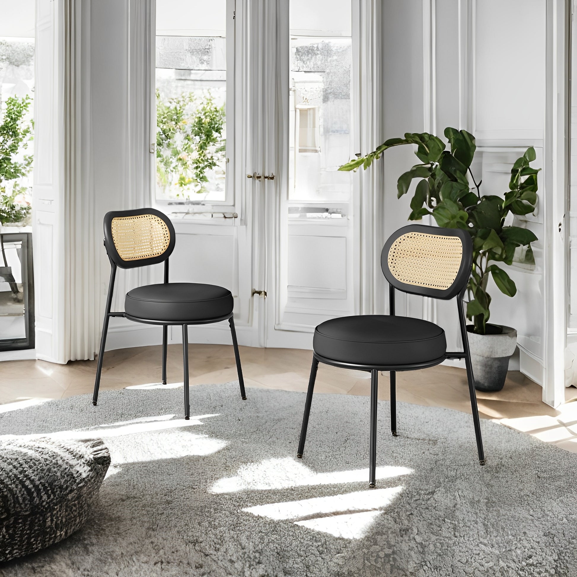 Boho Dining Chairs, Set of 2 PE Rattan Back & Synthetic Leather Upholstered Accent Chairs for Kitchen, Living Room, Ergonomic Support with Leveling Feet, Ink Black