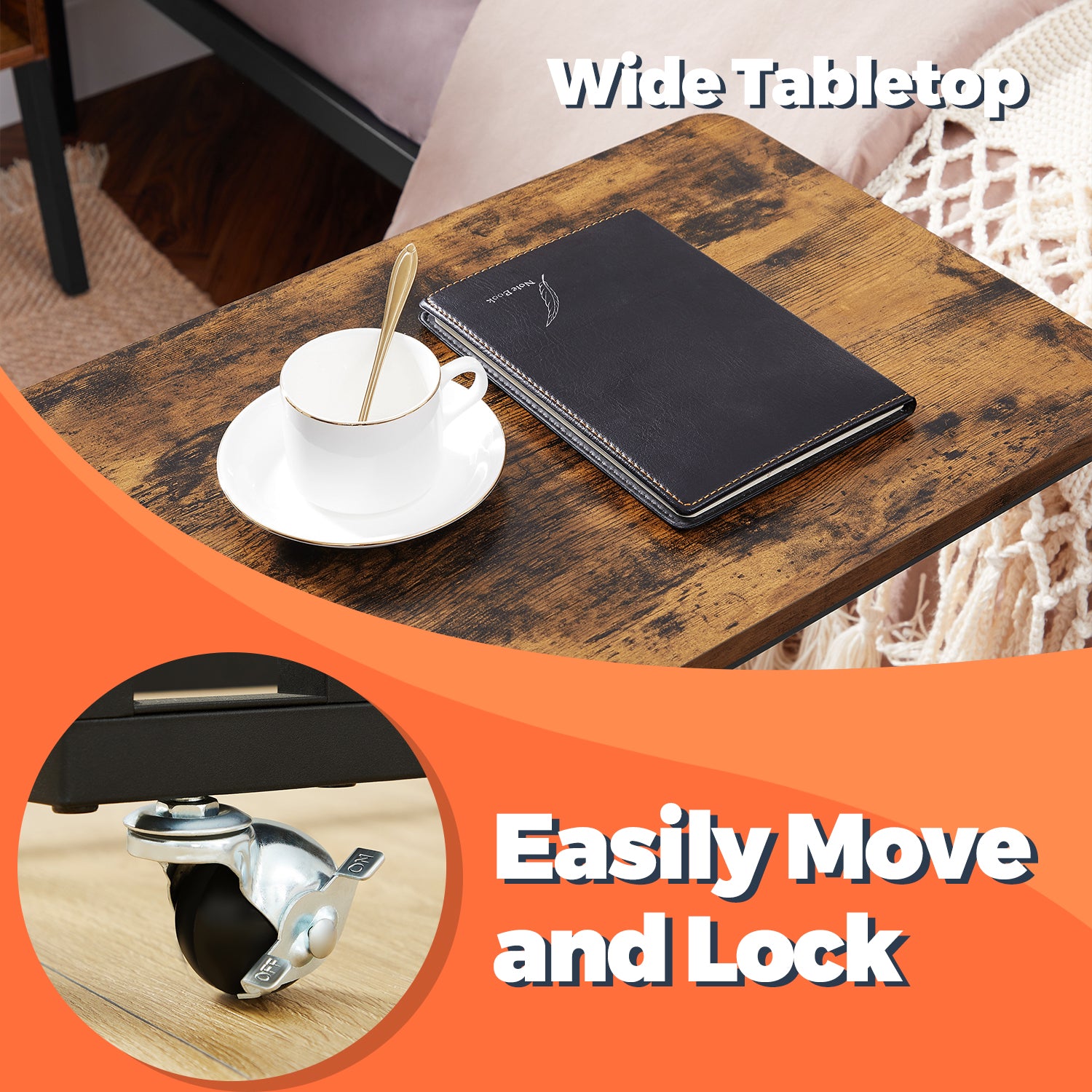 C-Shaped End Table with Wheels - Industrial Side Table for Sofa & Bed, Adjustable Height, Rustic Brown and Black