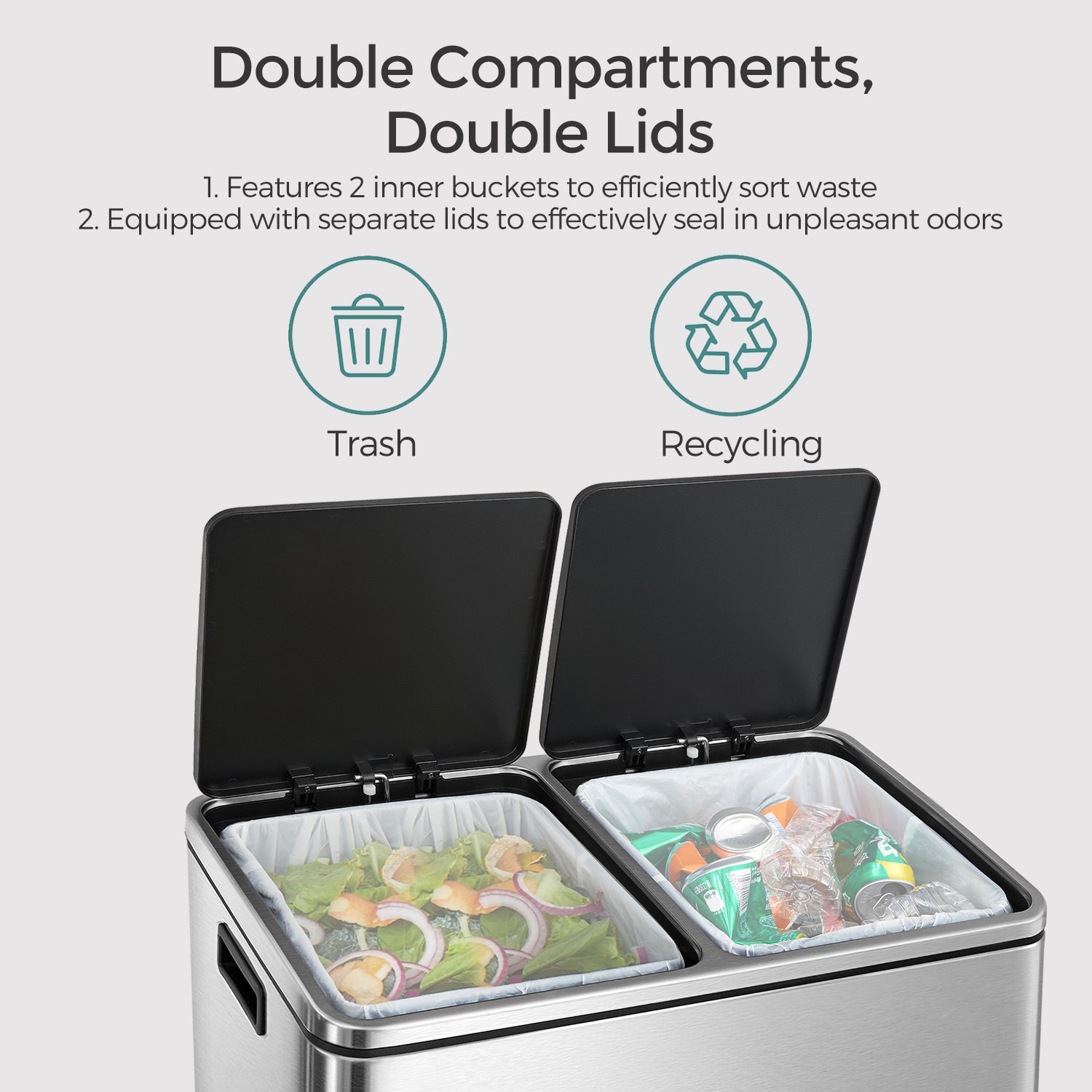 Dual Compartment Kitchen Trash Can, 2x8 Gallon Step Bin with Inner Buckets & Soft-Close Lid, Includes 15 Trash Bags,Silver and Black