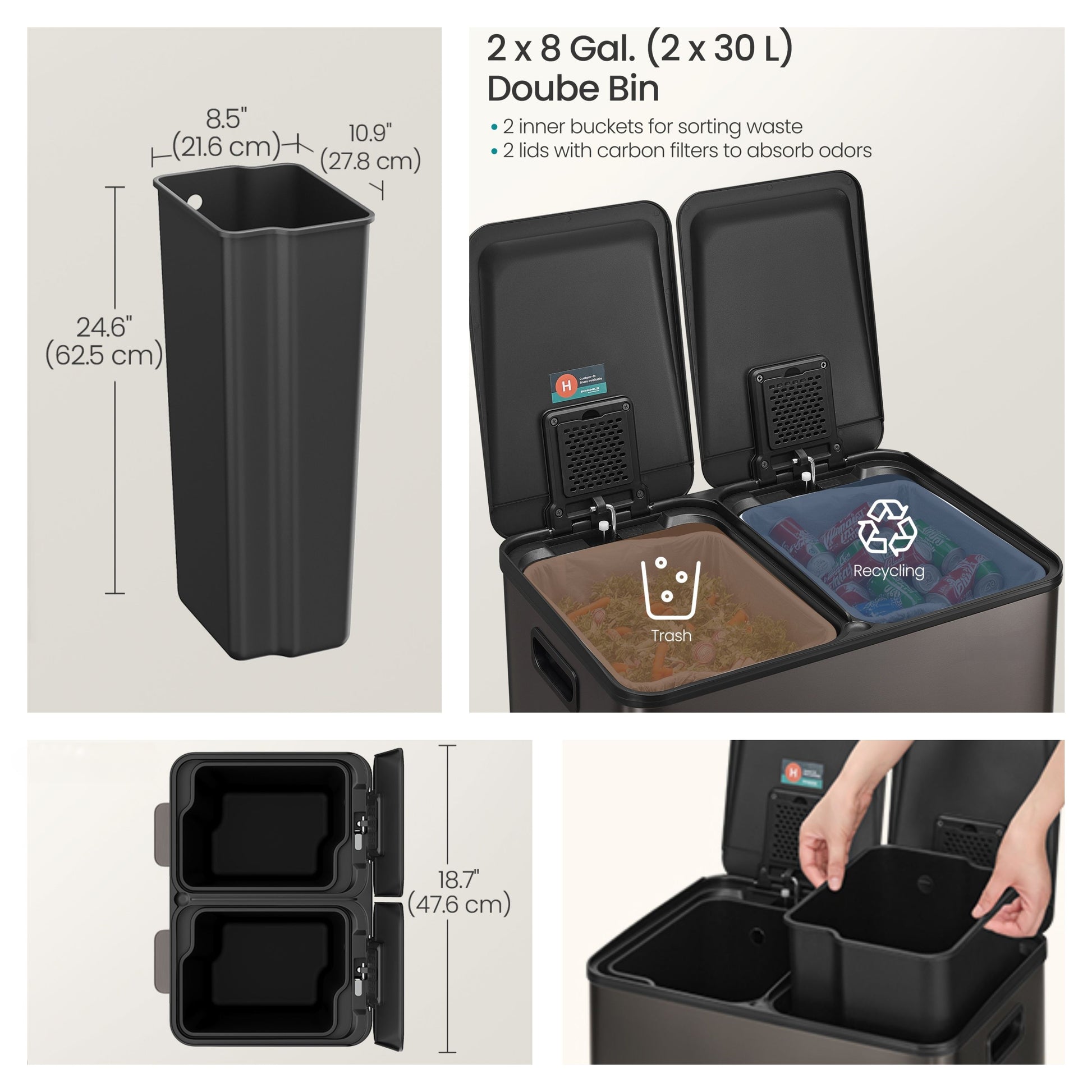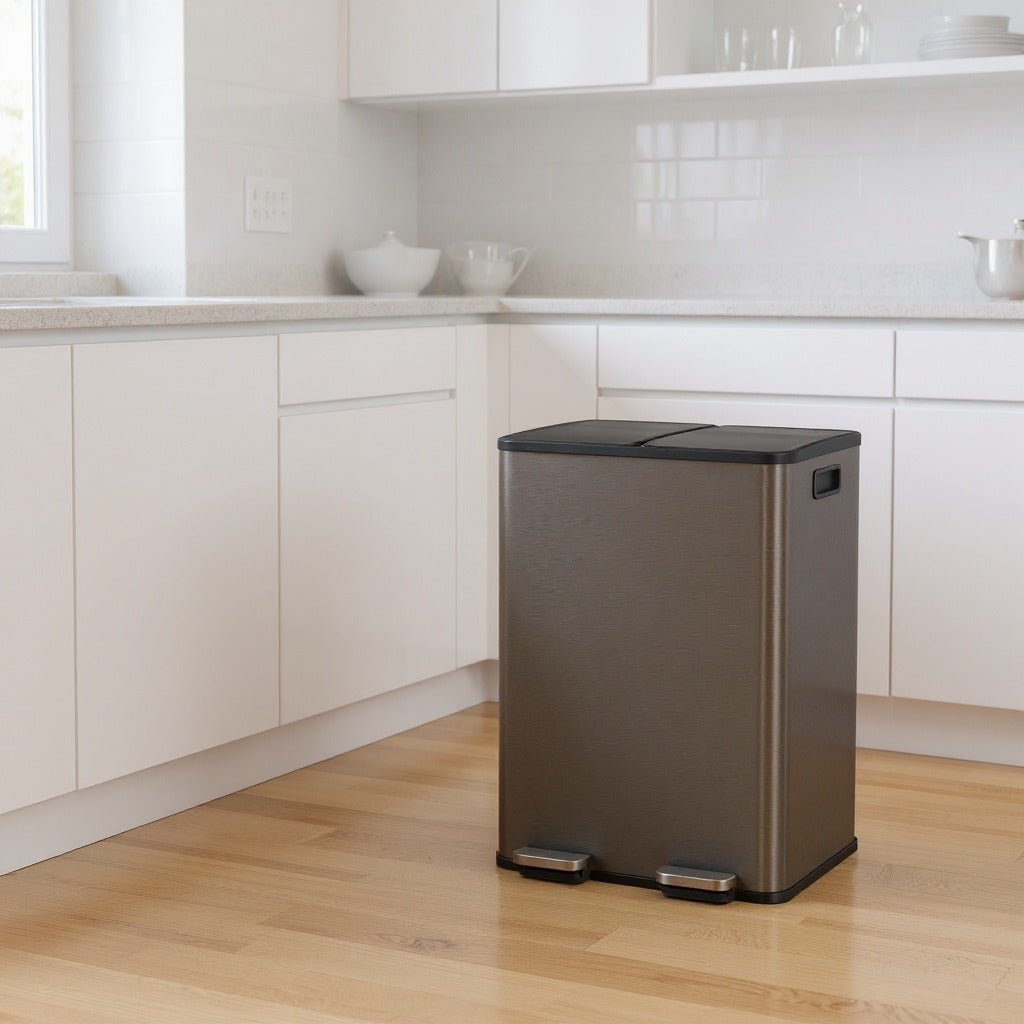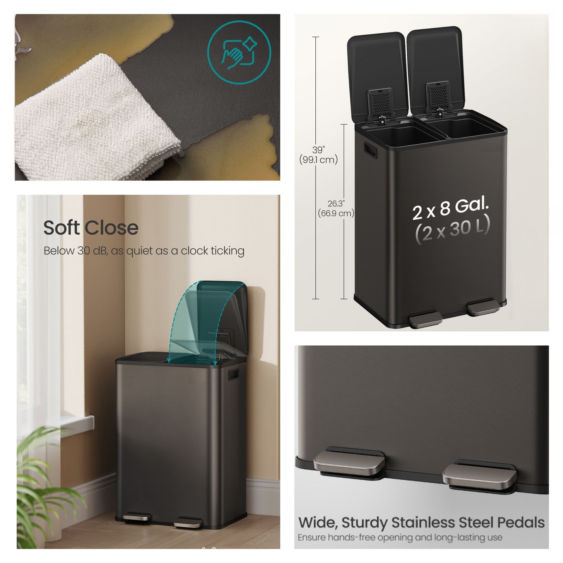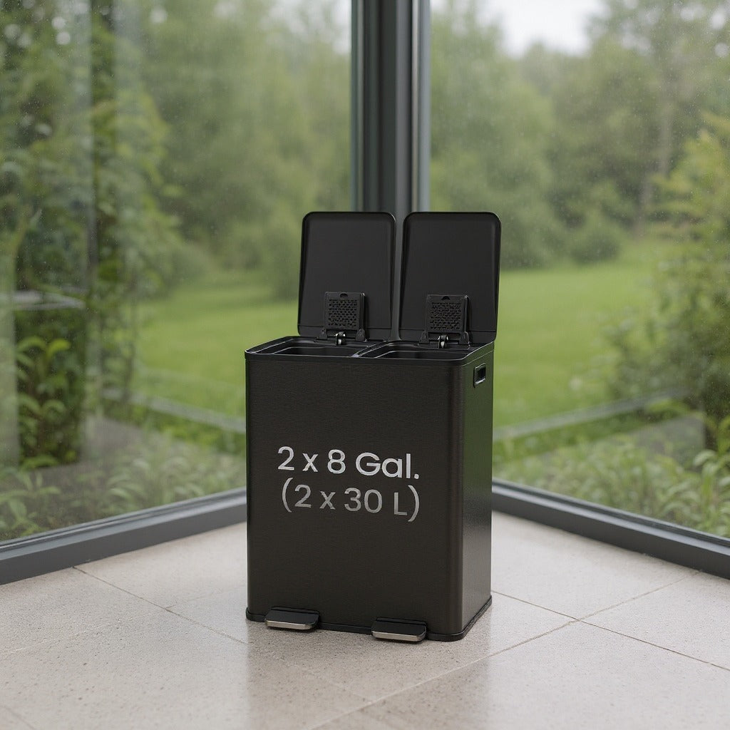 Dual Compartment Step Trash Can, 2 x 8-Gallon Soft-Close Lid Garbage Bin with Pedal, Inner Buckets and Liners Included, Stainless Steel,Slate Gray