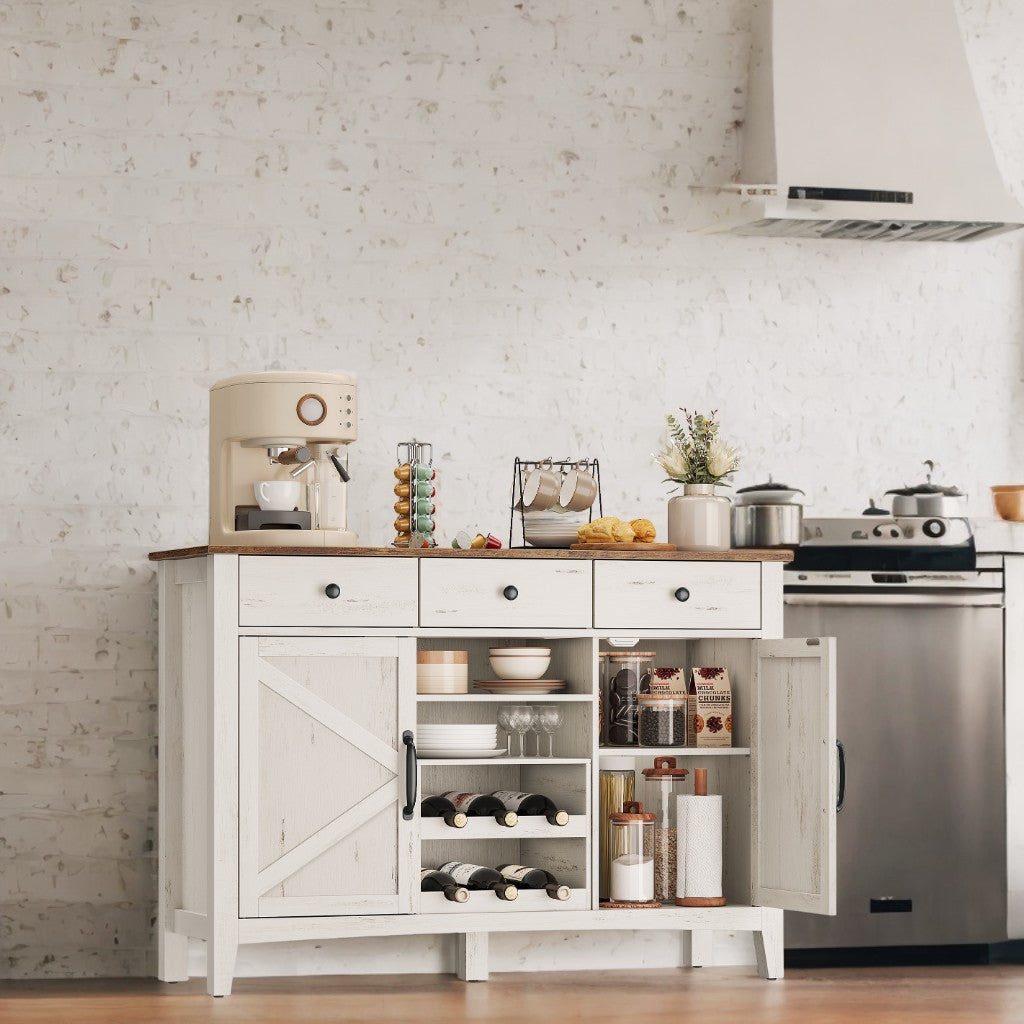Farmhouse Coffee Bar Cabinet with 3 Drawers - Adjustable Shelf Storage, Multi-Functional Sideboard, Rustic White and Honey Brown