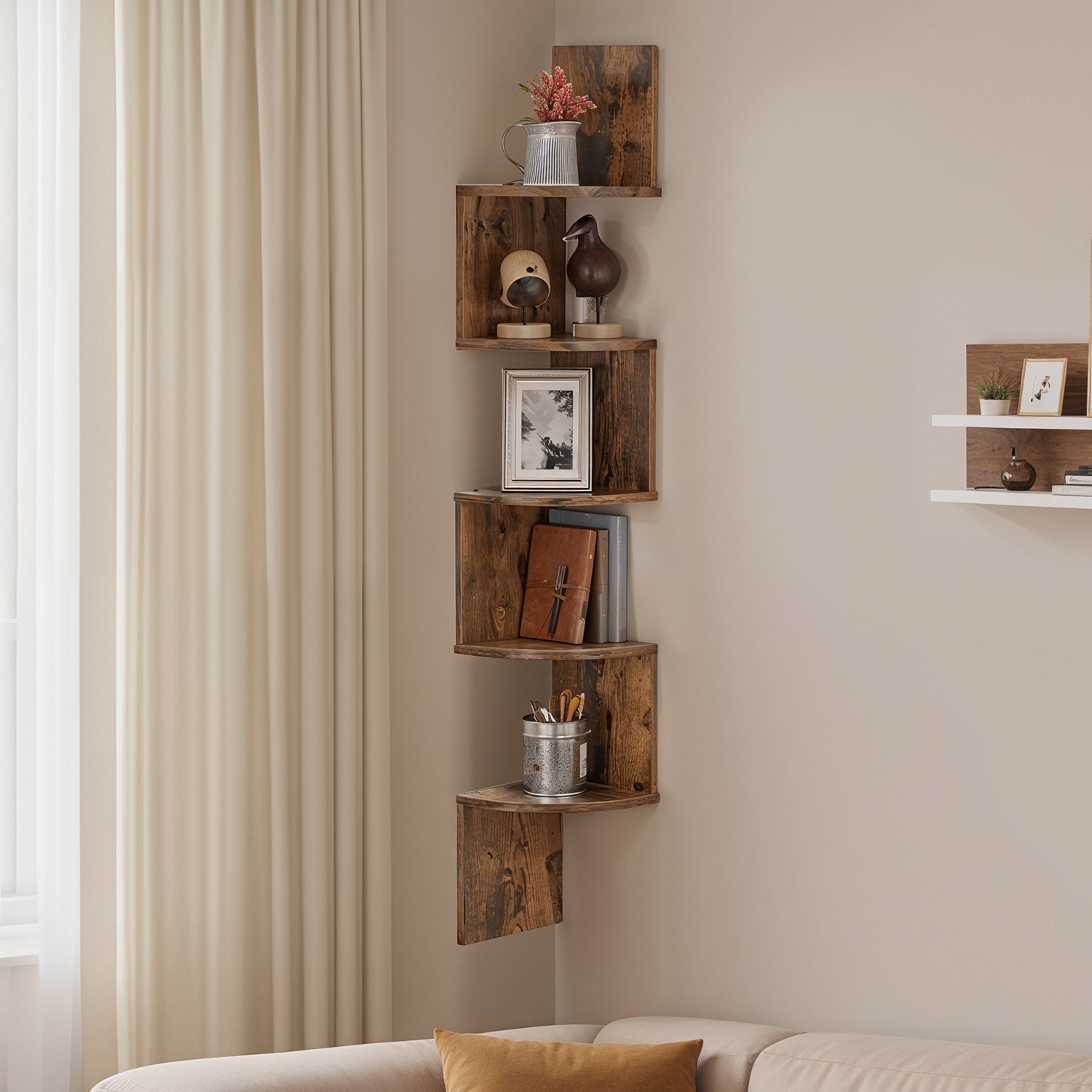 Floating Corner Shelf - 5-Tier Wall Mount Bookshelf, Space-Saving Design, 13.2lb Capacity per Shelf, Rustic Brown