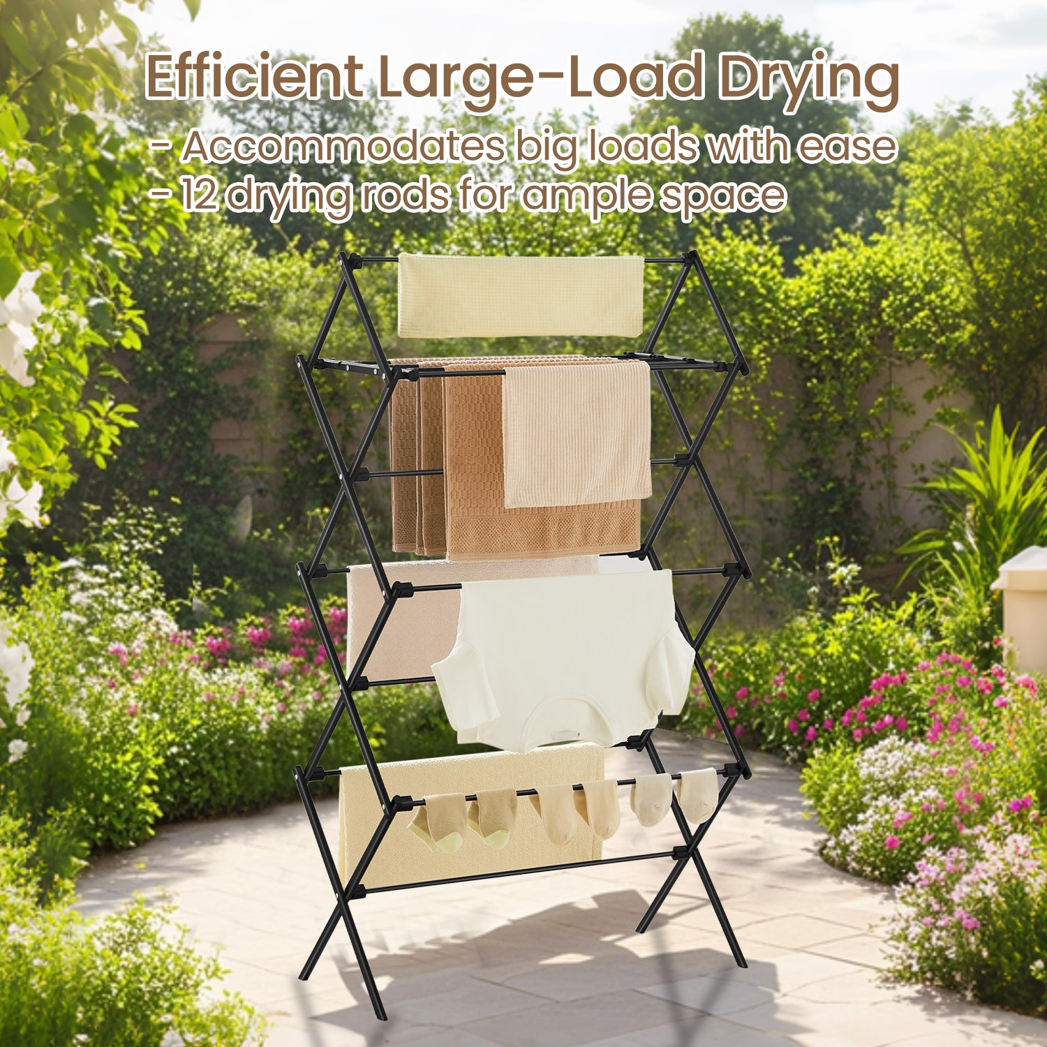 "1. Space-Saving Drying Power – With 12 rods in a compact 14.6”D x 29.5”W frame, this airer dries more clothes in less space—perfect for towels, delicates, and even shoes.