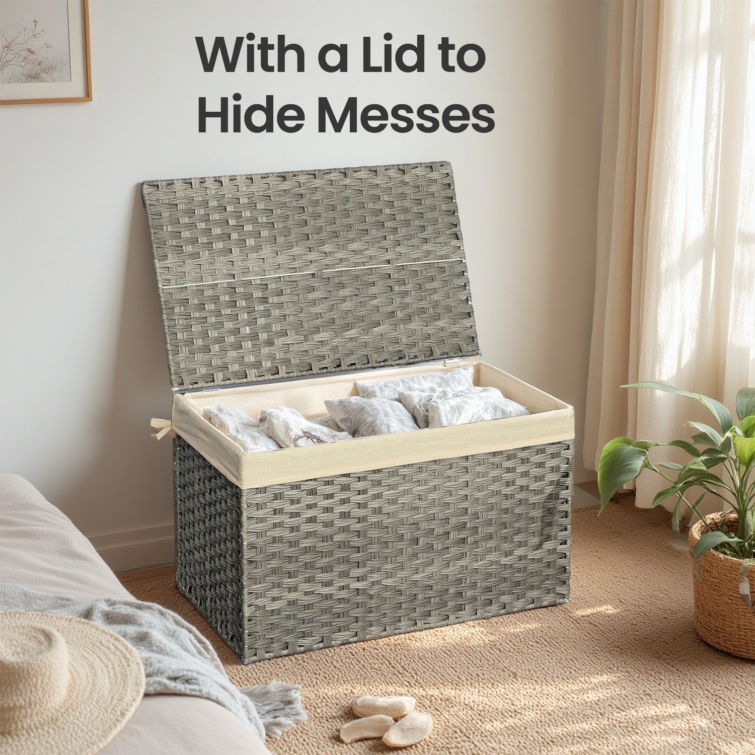 Foldable Storage Basket with Lid, 42.3 Gallon (160L) Large Capacity, Woven PP Rattan & Metal Frame, Removable Liner, for Laundry,Blankets,Bedroom, Gray